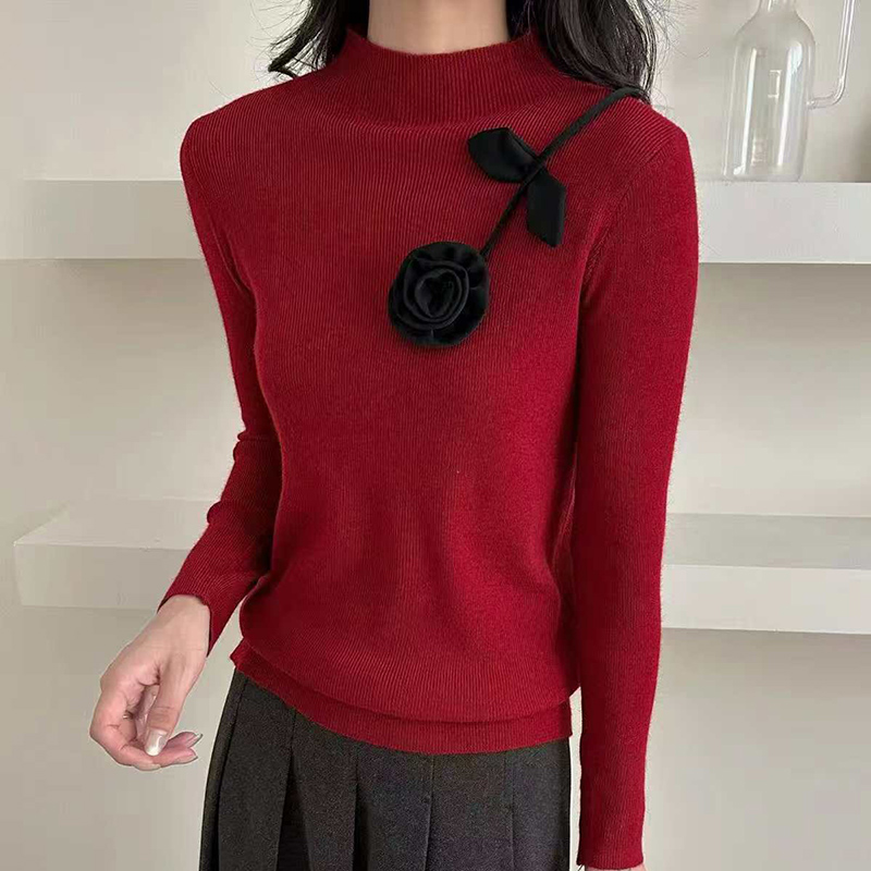 高级感2025秋季新款立体花朵针织衫女半高领修身打底上衣羊绒毛衣