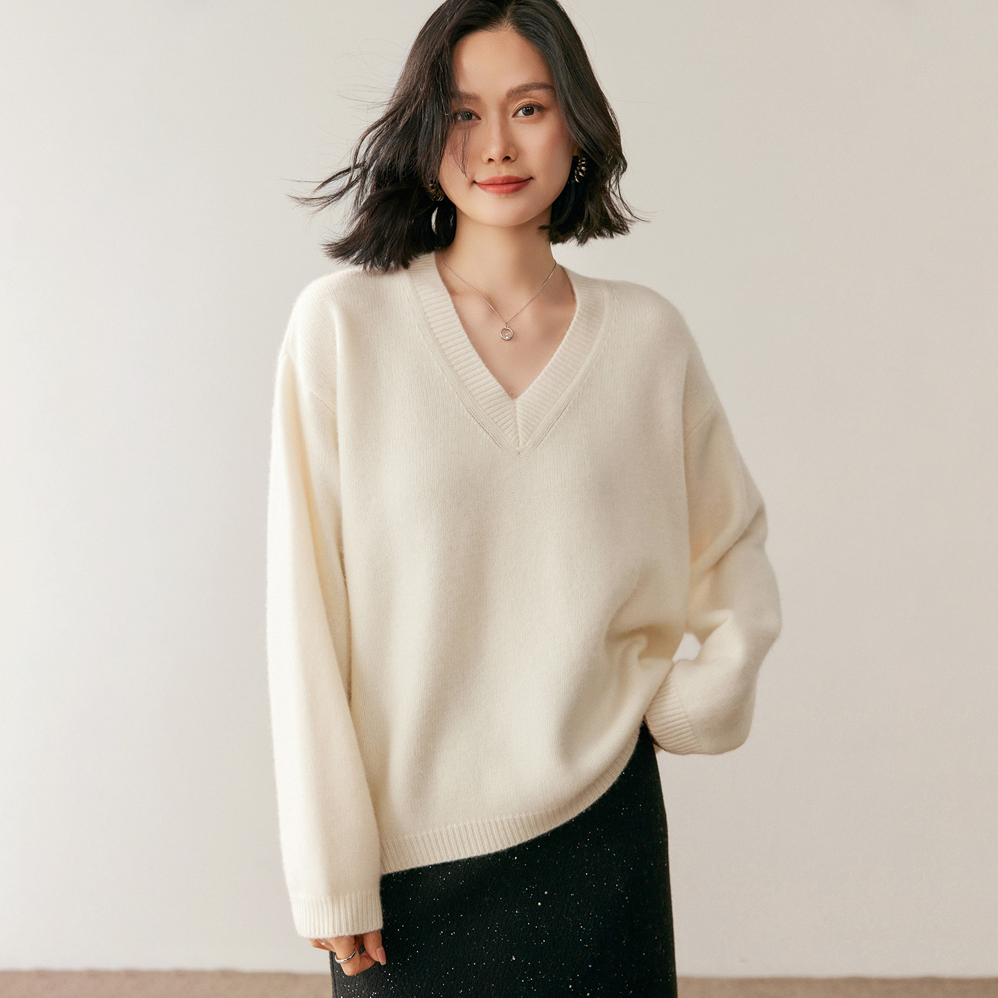 【假一赔十】35%山羊绒廓版毛衣女极简风高级感V领针织打底衫送礼