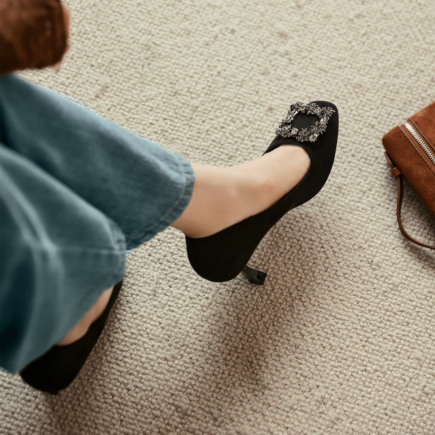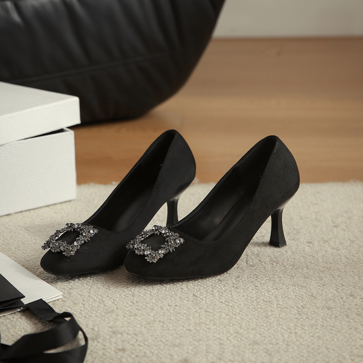 大码高跟鞋女细跟加肥加宽水钻方扣百搭通勤不累脚单鞋绒面黑色