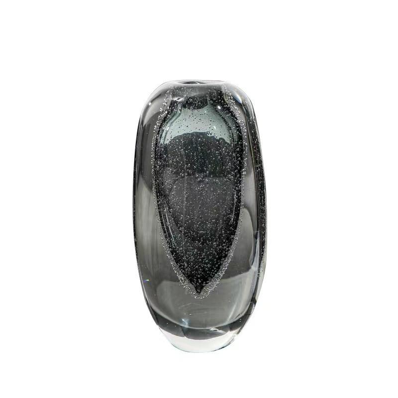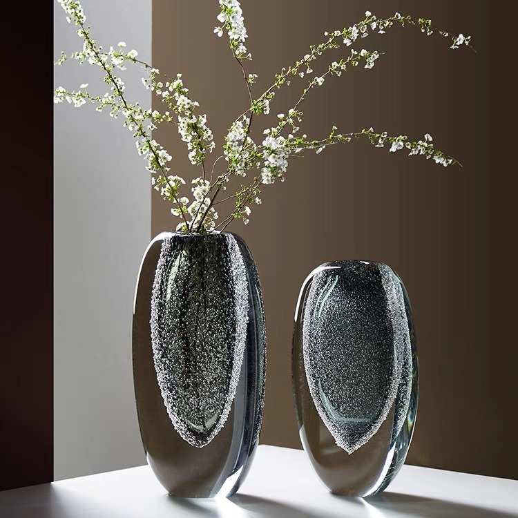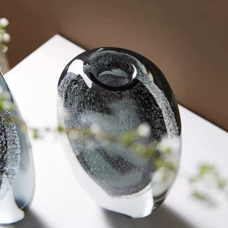 欧式简约手工吹制高品质厚底灰色气泡玻璃花瓶软装样板房客厅花器