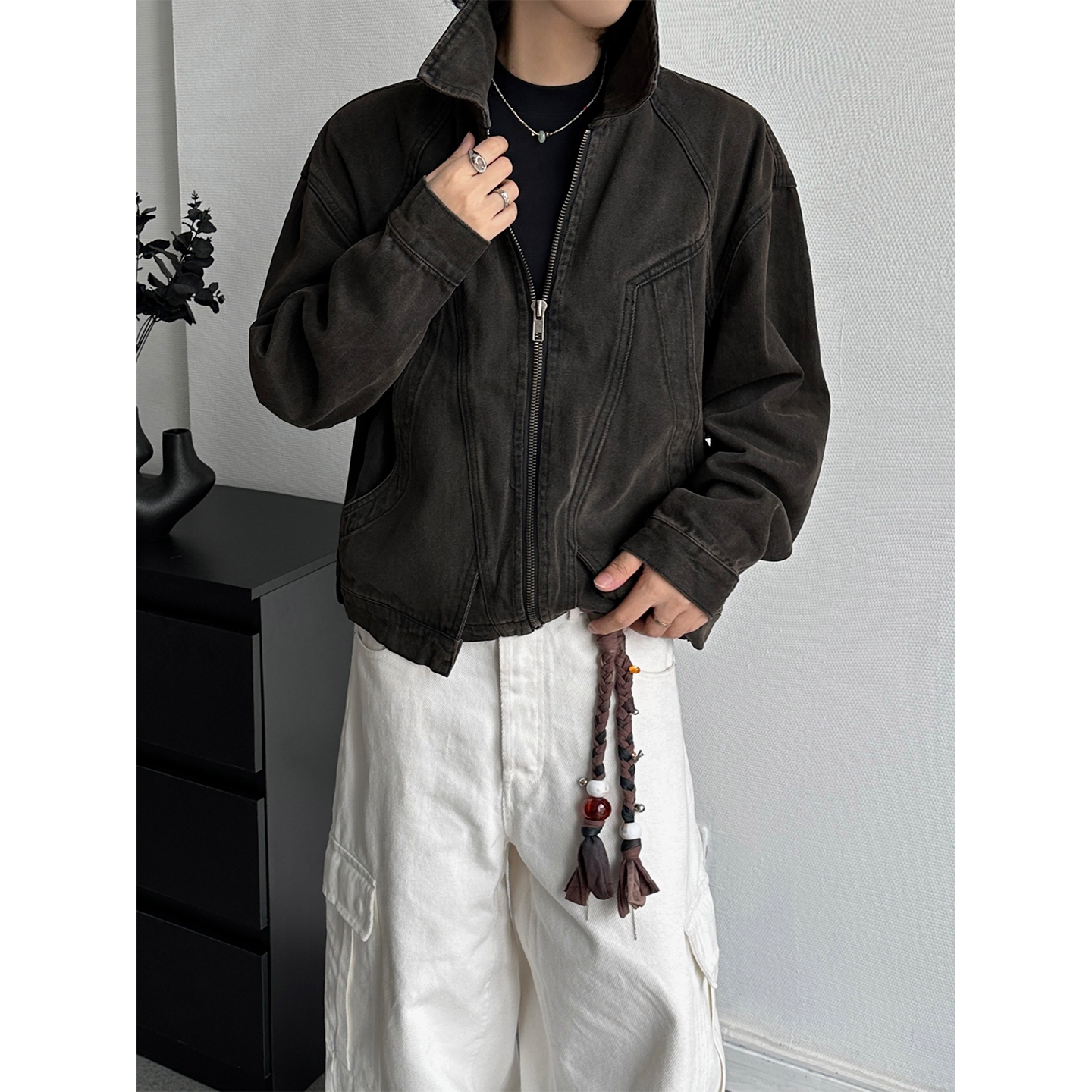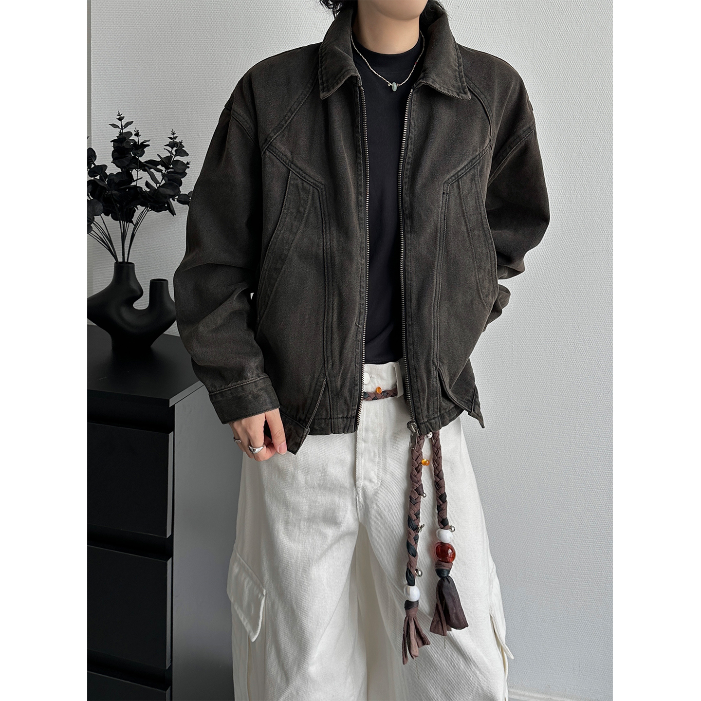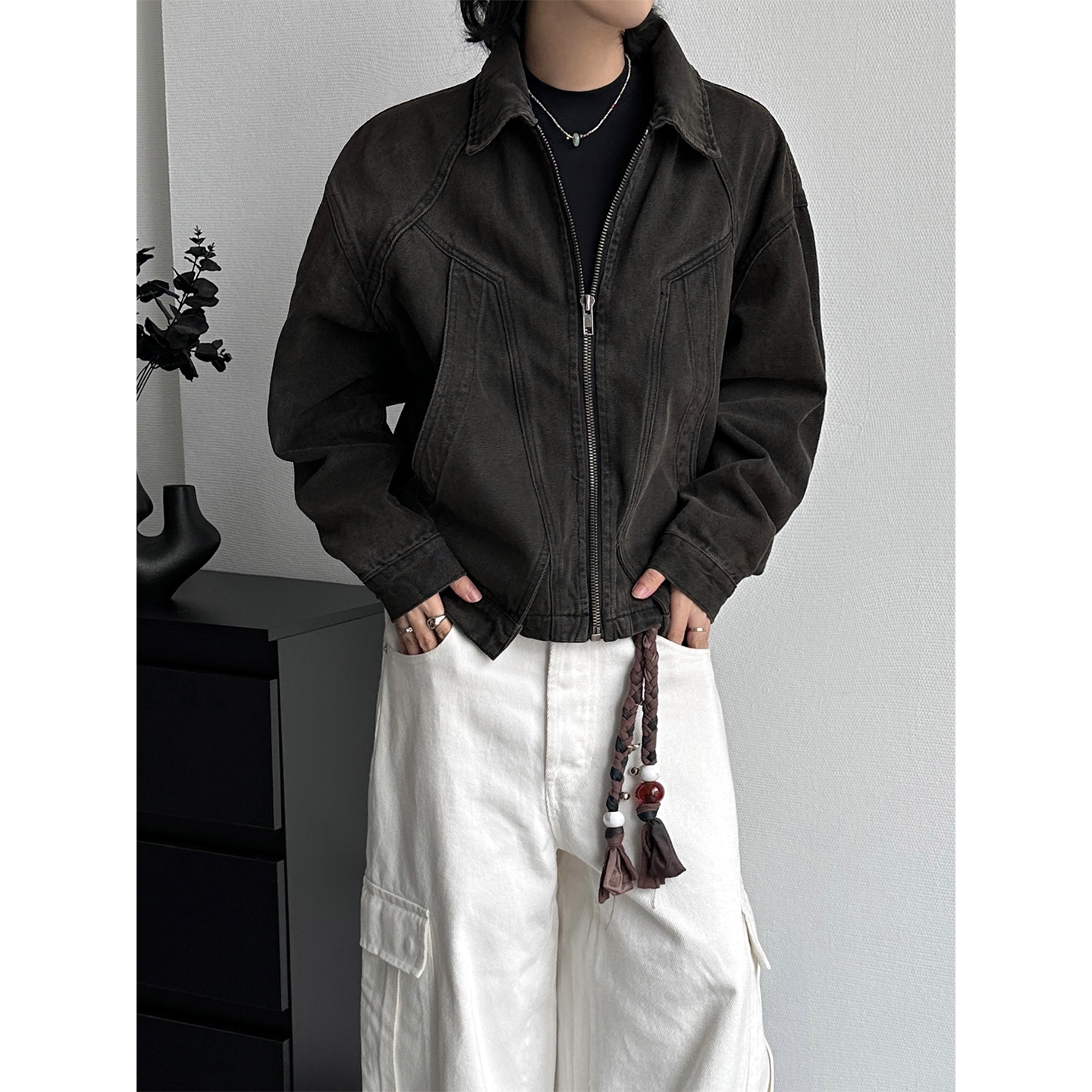 解构复古水洗翻领短款牛仔衣2025秋冬男女无性别美式机车夹克外套