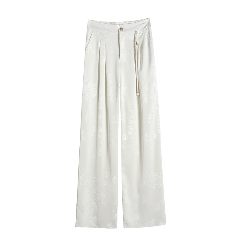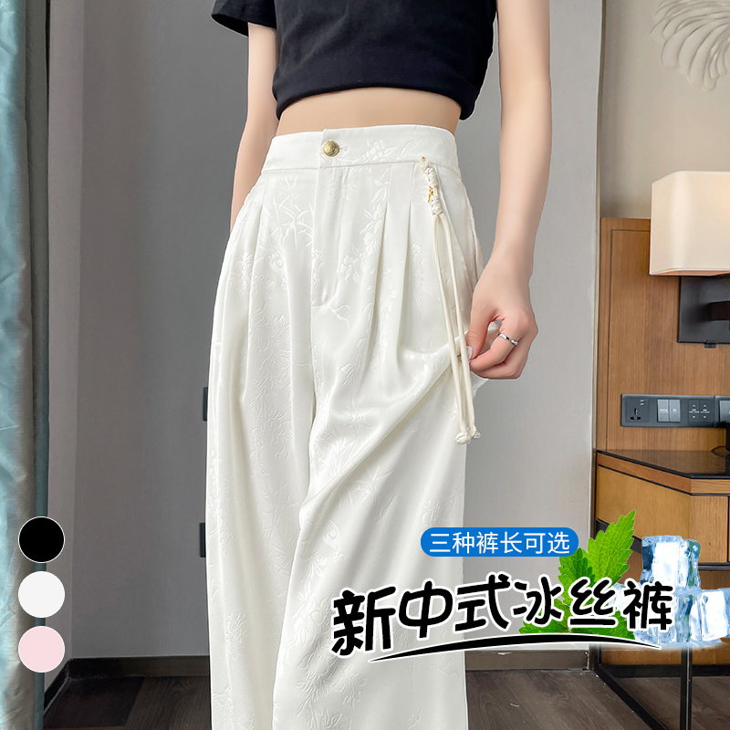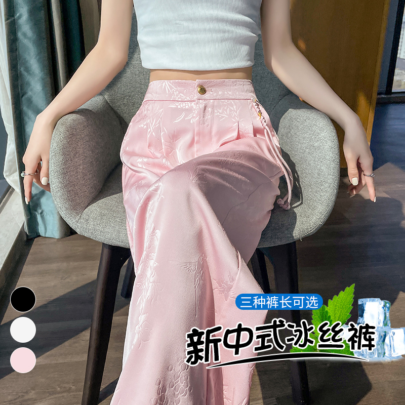 实拍2024夏季新中式缎面提花冰丝裤国风西装裤窄版阔腿裤女