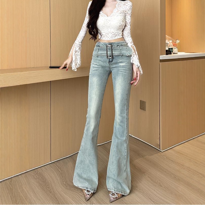 李李服饰浅色水洗宽腰带微喇牛仔裤女25秋季新款显瘦显腿长弹力裤