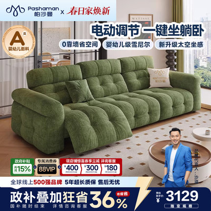 帕沙曼功能沙发电动布艺小户型客厅复古风棉花糖绿色沙发雪尼尔绒