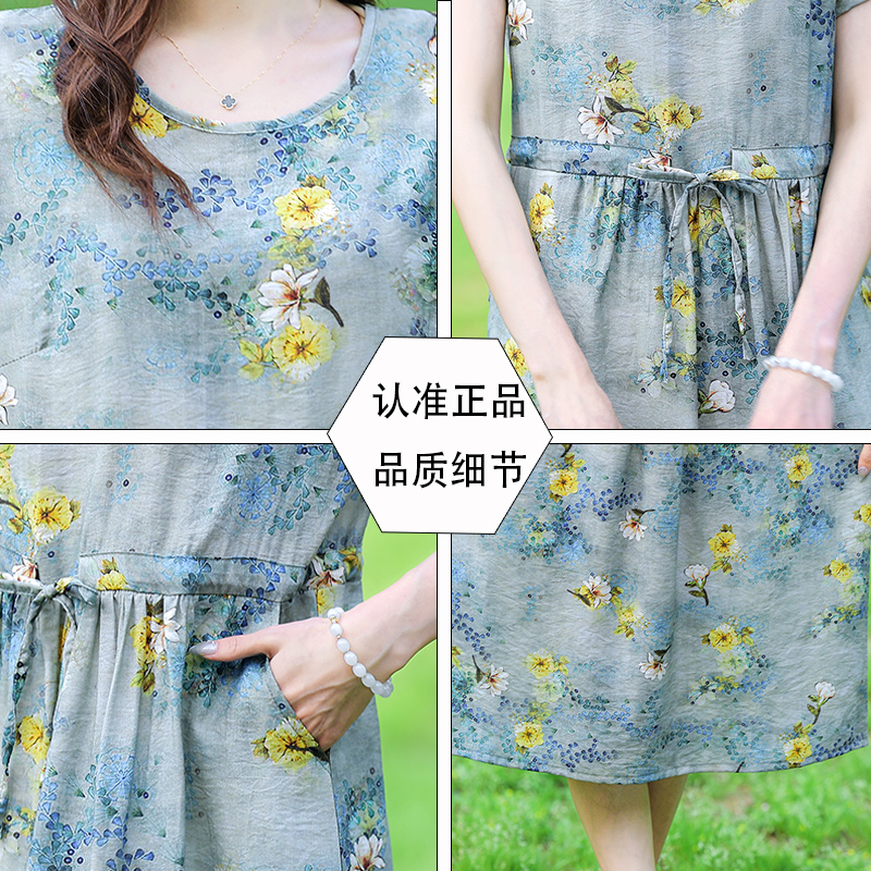 夏季新款小碎花丝麻短袖连衣裙中长款年轻中年妈妈装宽松遮肉裙子