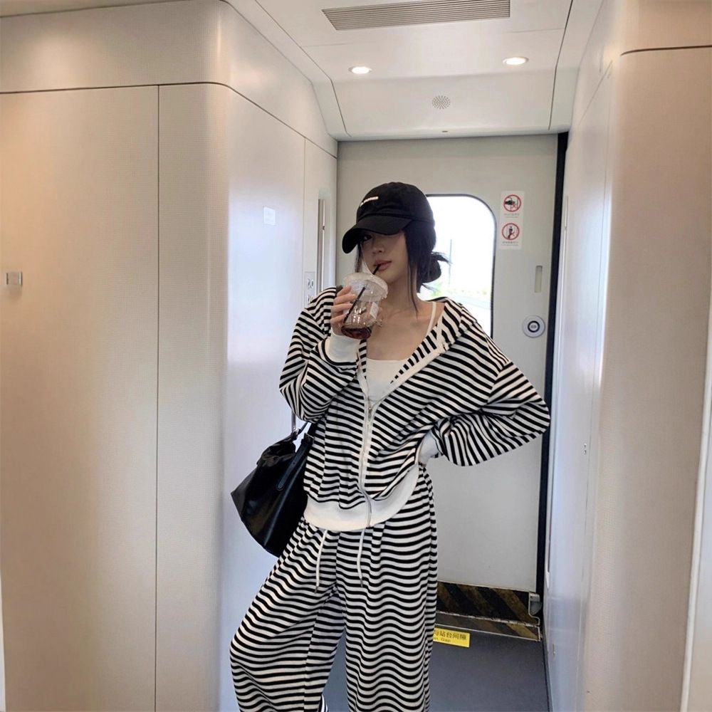 美式复古慵懒风秋季宽松条纹长袖连帽卫衣休闲裤新款两件套套装女