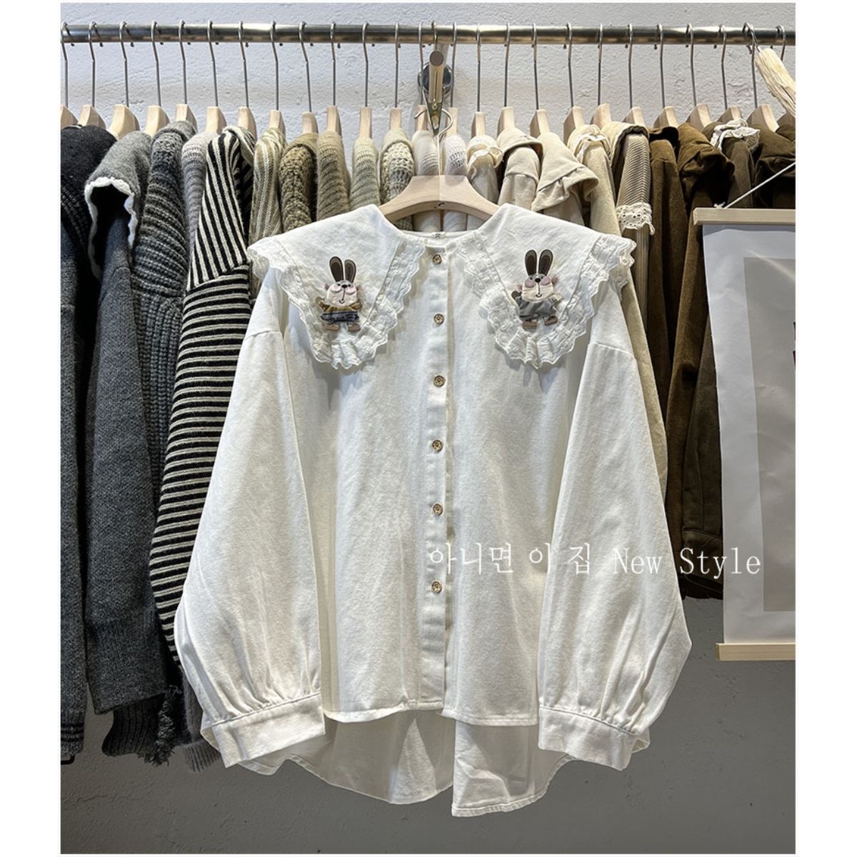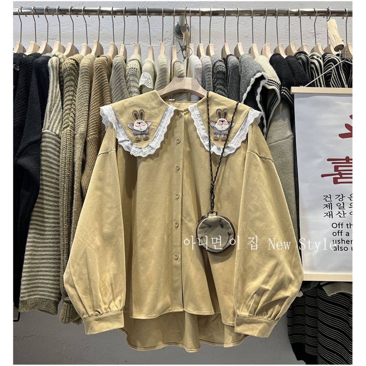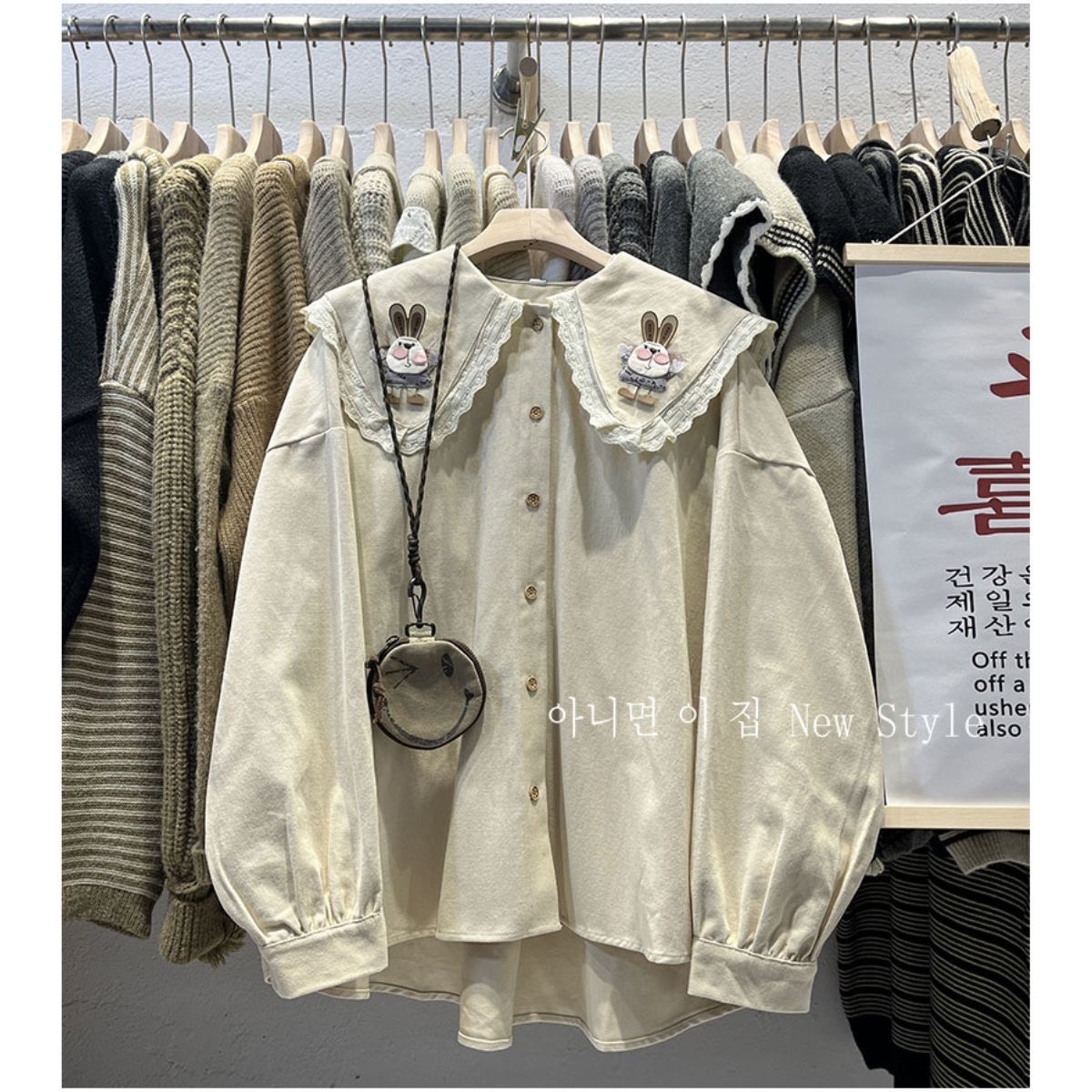 日系花边森系娃娃领宽松复古学院风宽松大码长袖叠穿衬衫上衣女秋