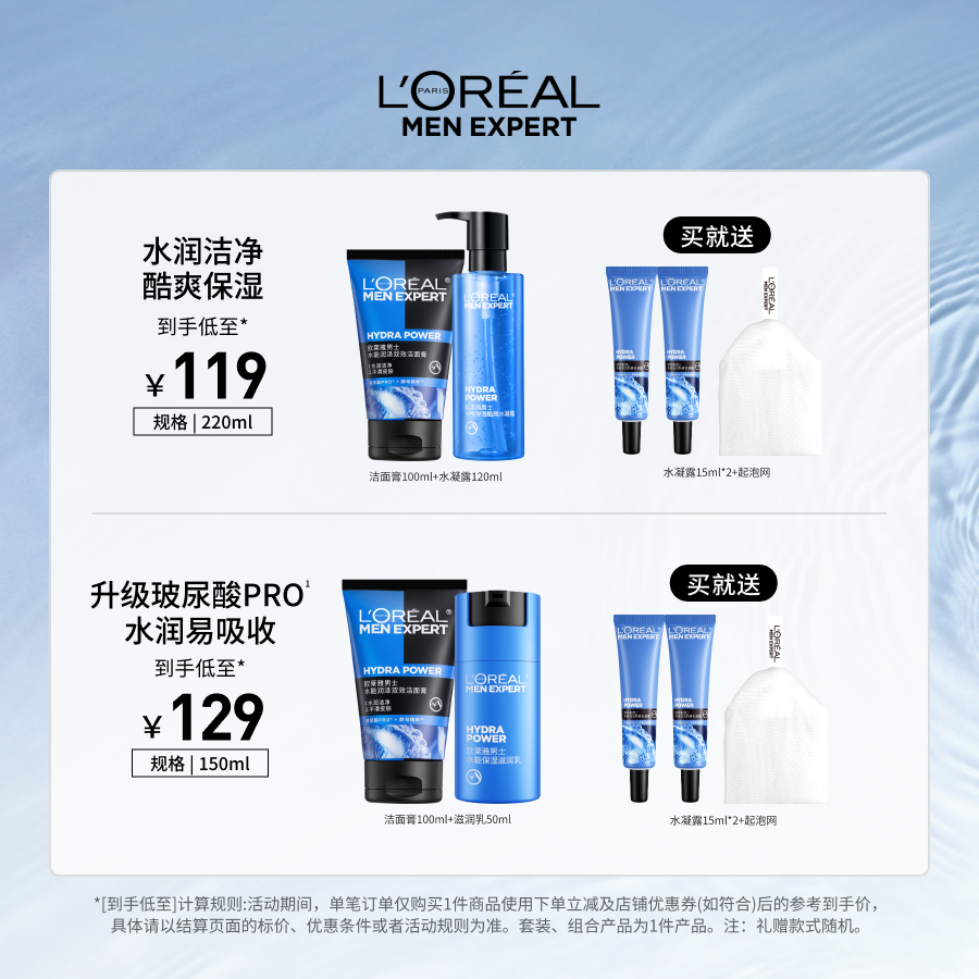 欧莱雅男士水能护肤套装双效洗面奶深层补水长久保湿酷爽男士专用