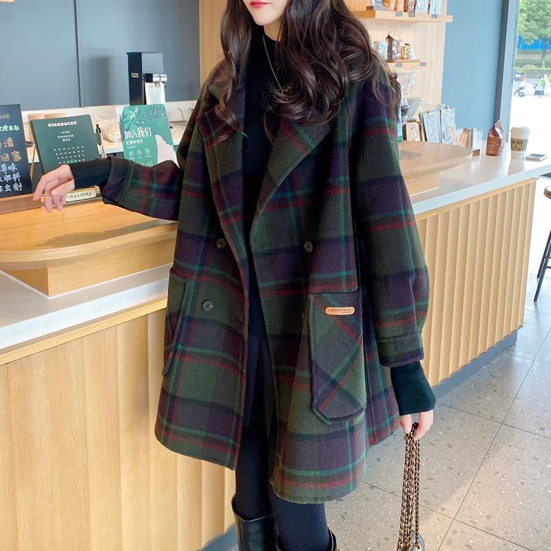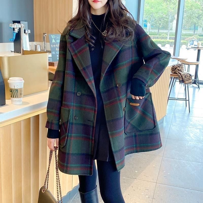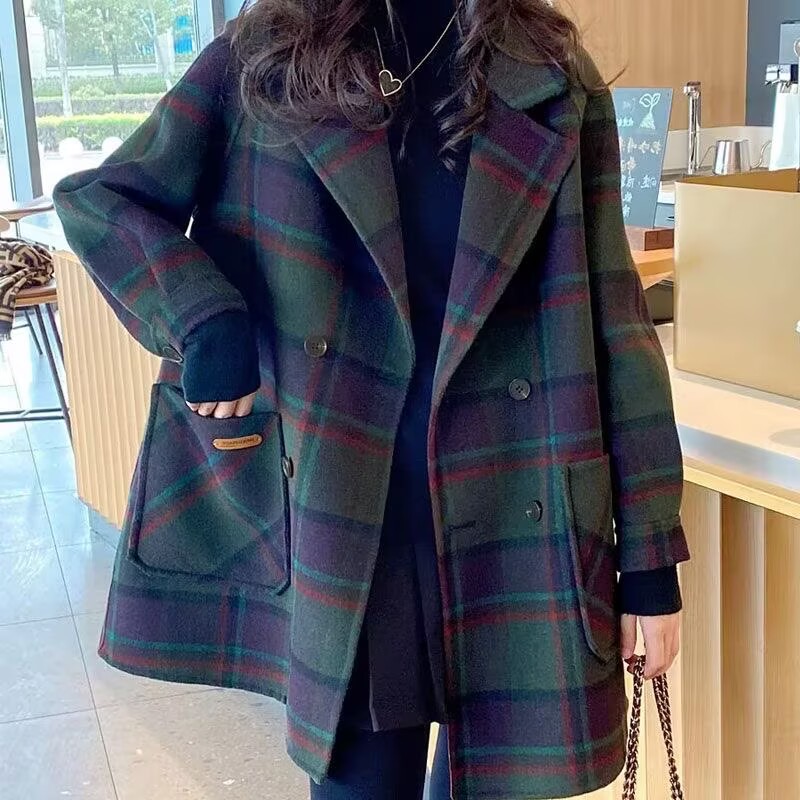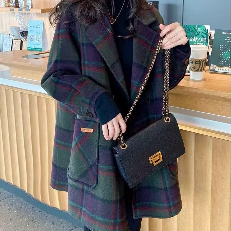 秋冬新款高端时尚轻奢高级感西装格子大衣女百搭双排扣毛呢外套潮
