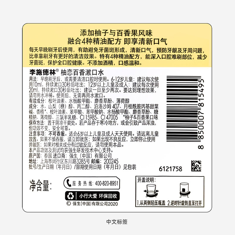 李施德林柚恋百香漱口水减少牙菌斑清洁口腔预防牙龈问题清新口气