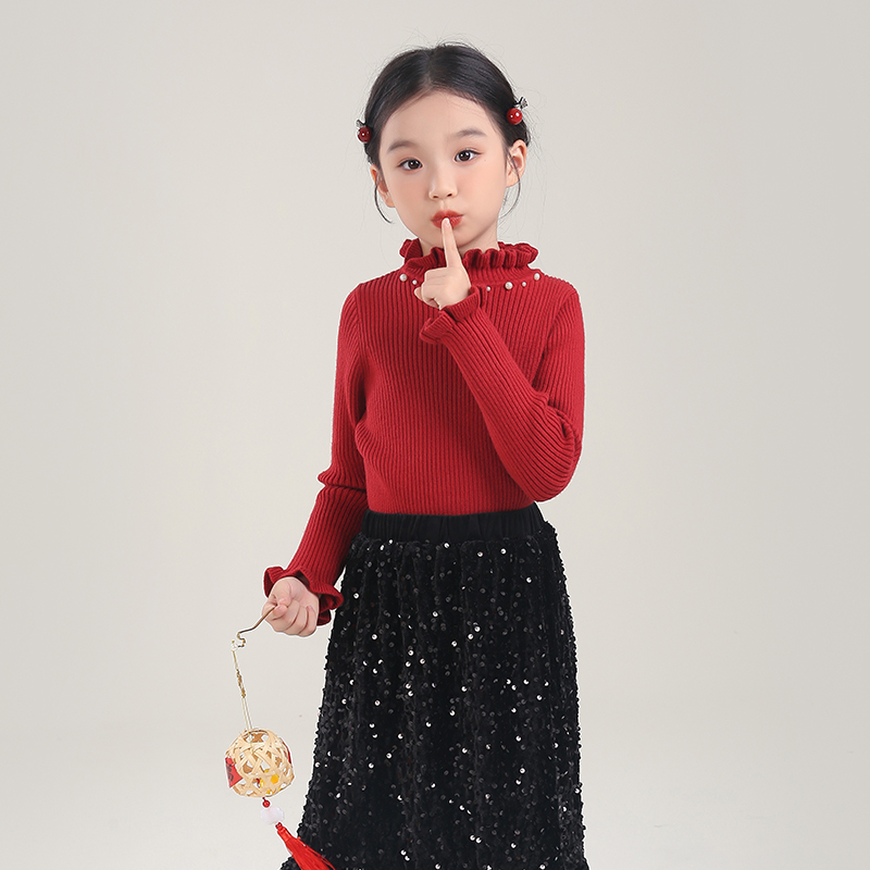 0769755女童打底衫毛衣冬装2025新款洋气中大童花边领针织衫上衣