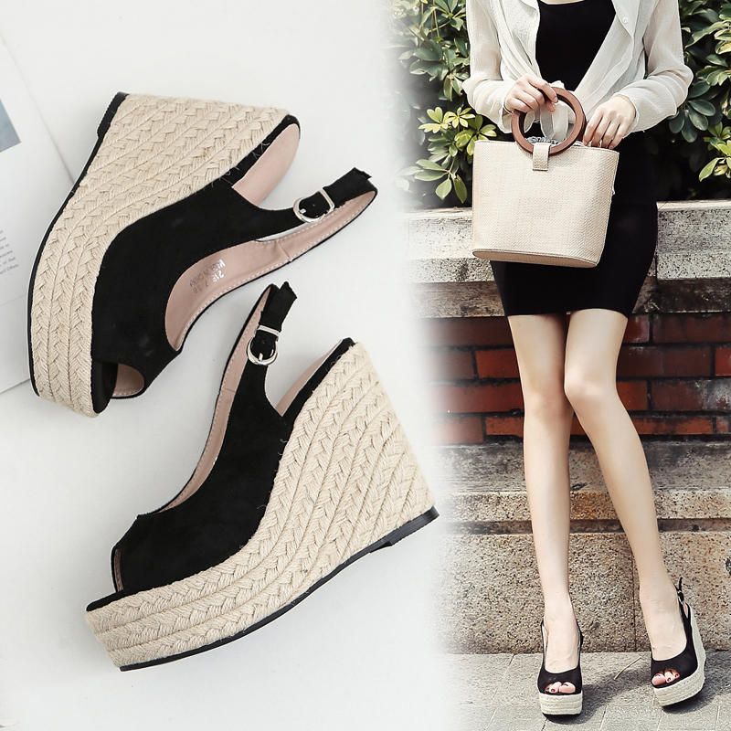 坡跟防水台时尚露趾草编凉鞋女