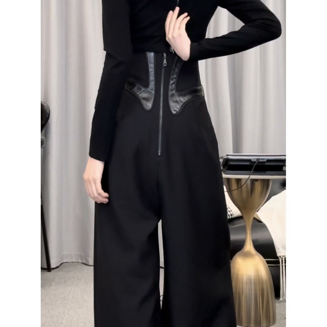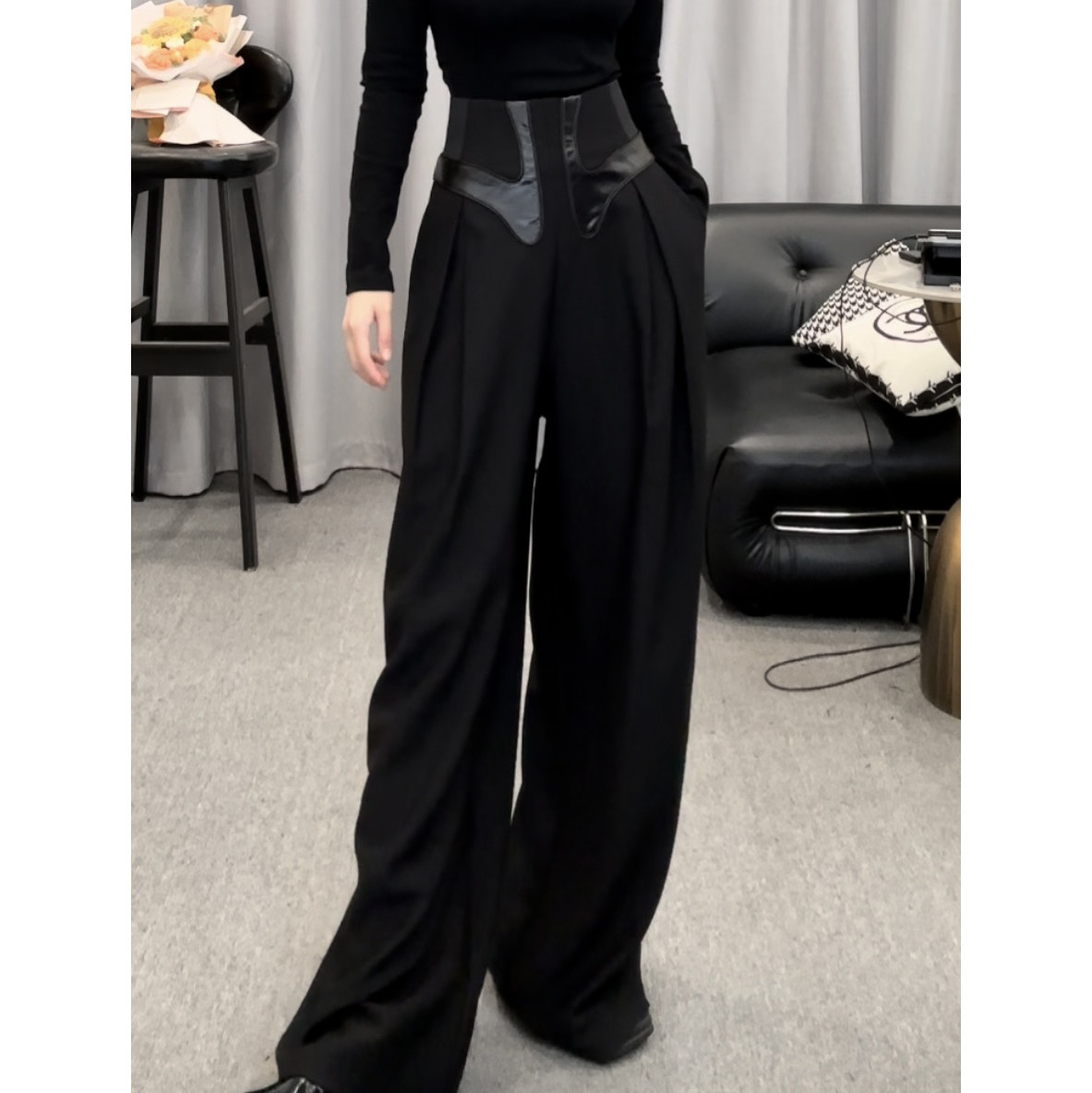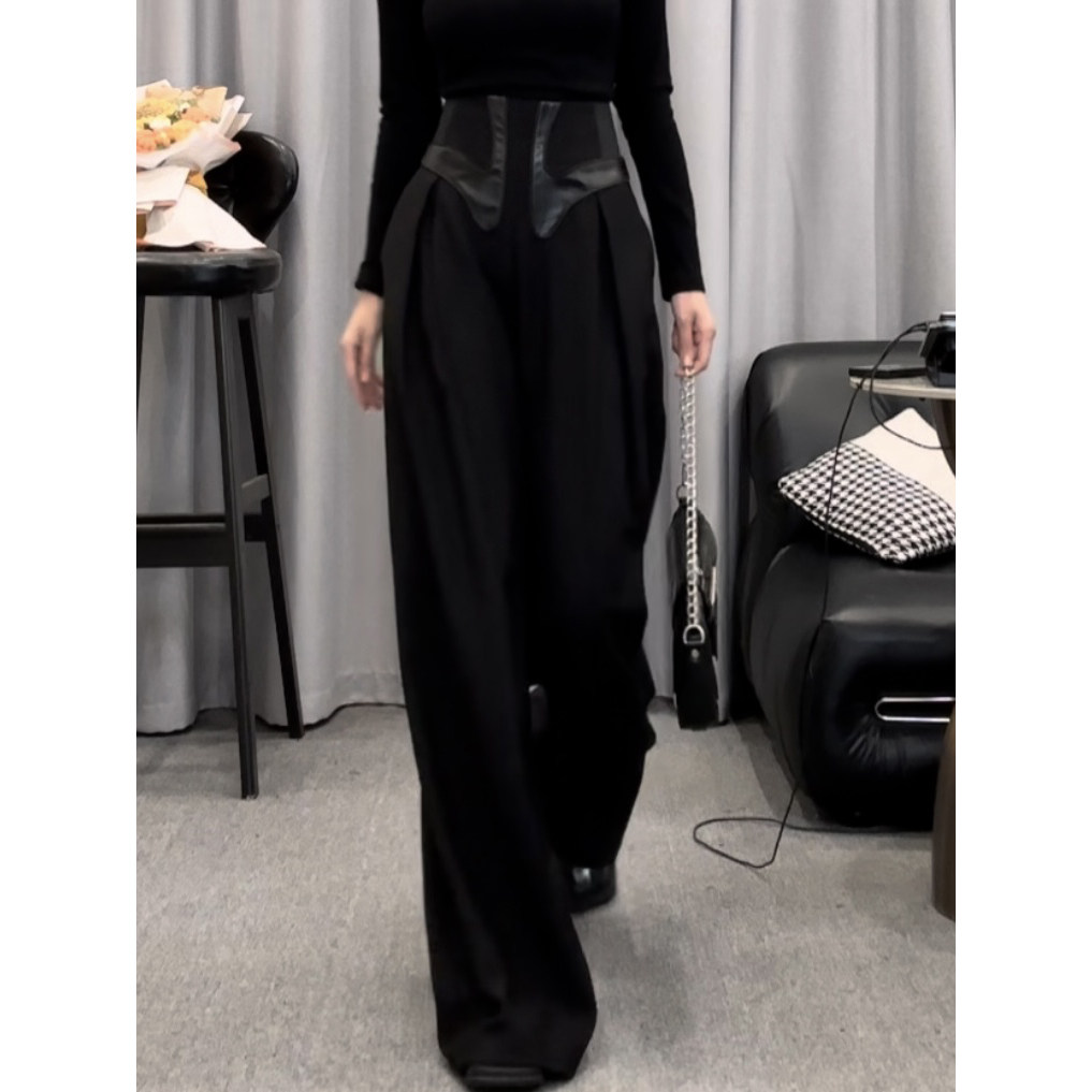 D6526黑色西装阔腿裤女秋季束腰拼皮高腰气质休闲裤垂感拖地裤