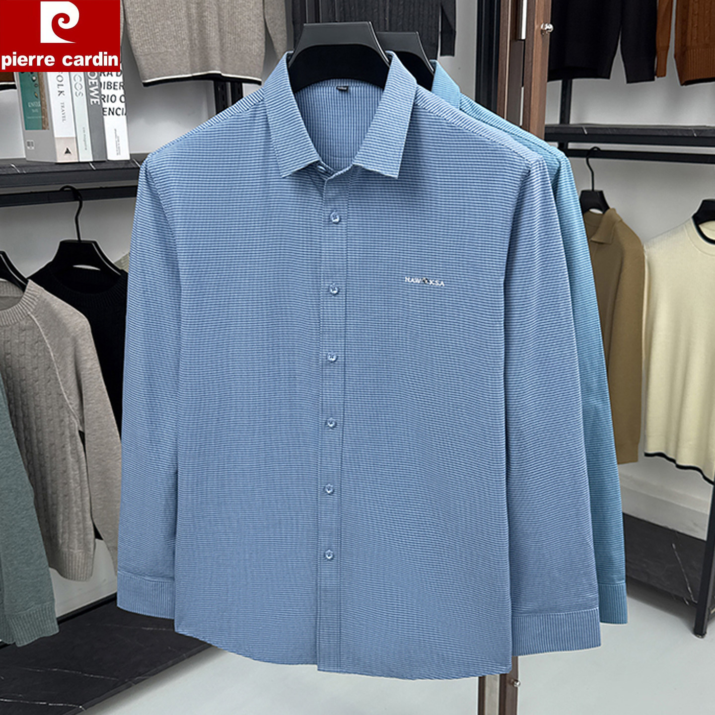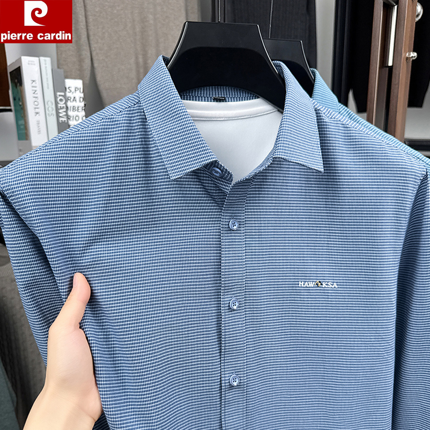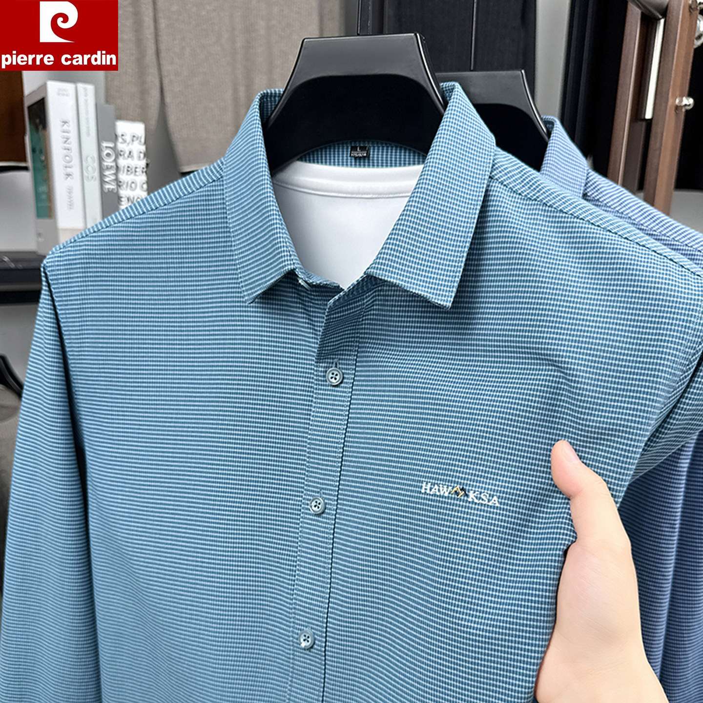 皮尔卡丹格子衬衫男长袖翻领商务休闲春秋款绣花衬衣男装透气寸衫