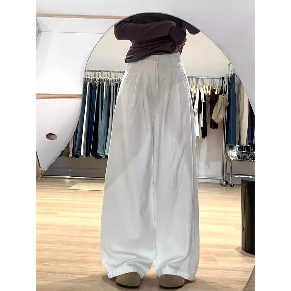 大码胖mm美式复古褶皱白色牛仔裤女秋冬高腰宽松显瘦感垂感阔腿裤
