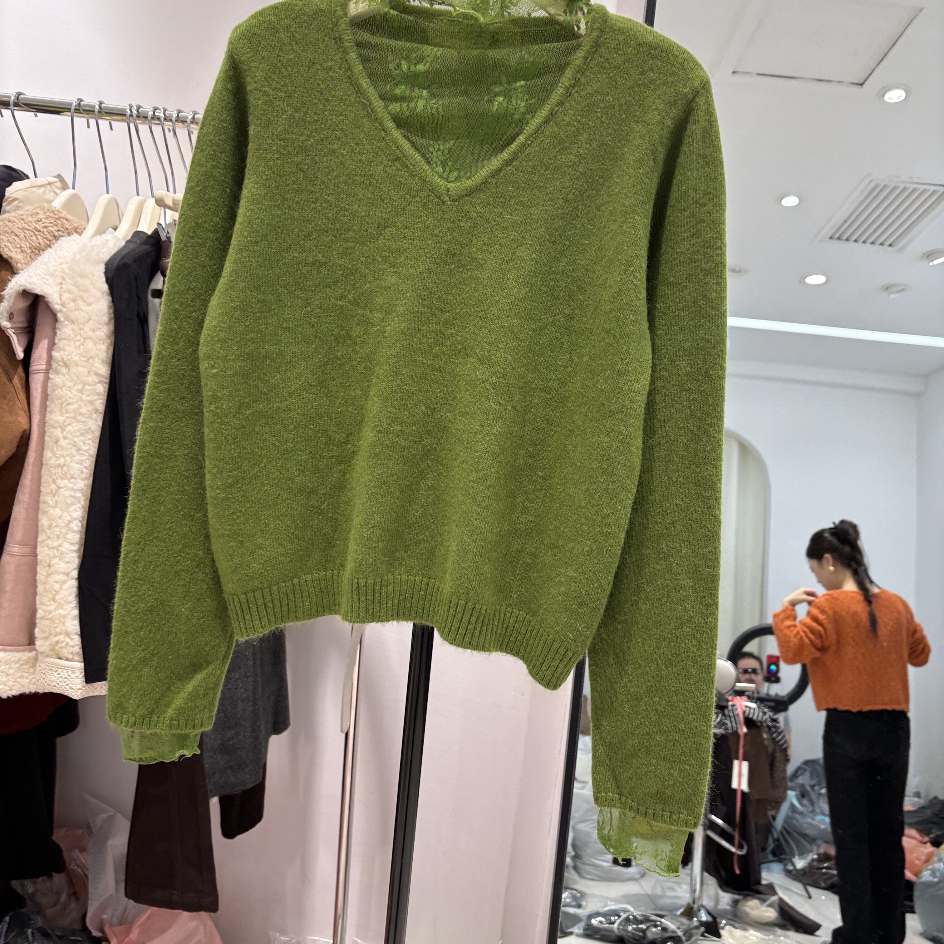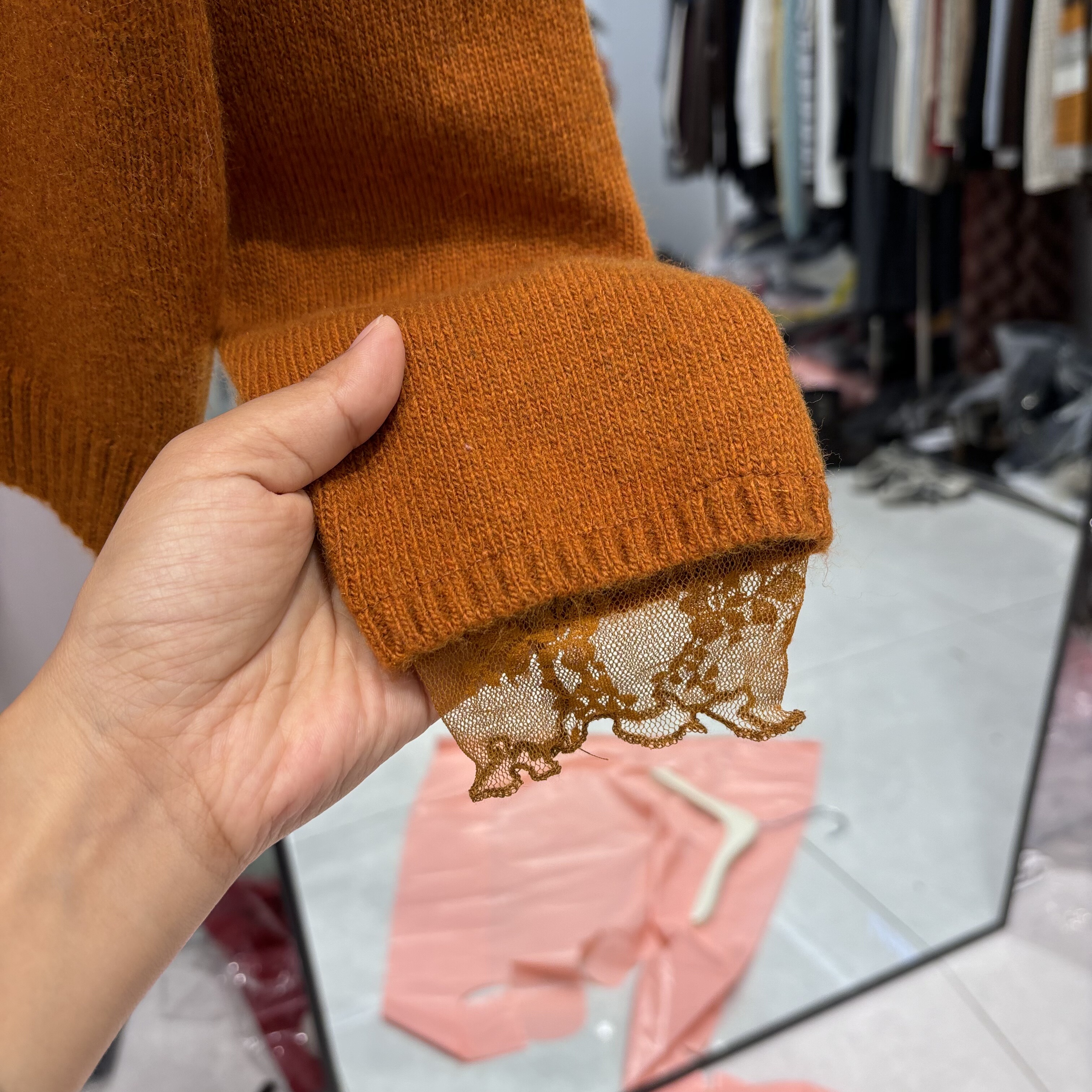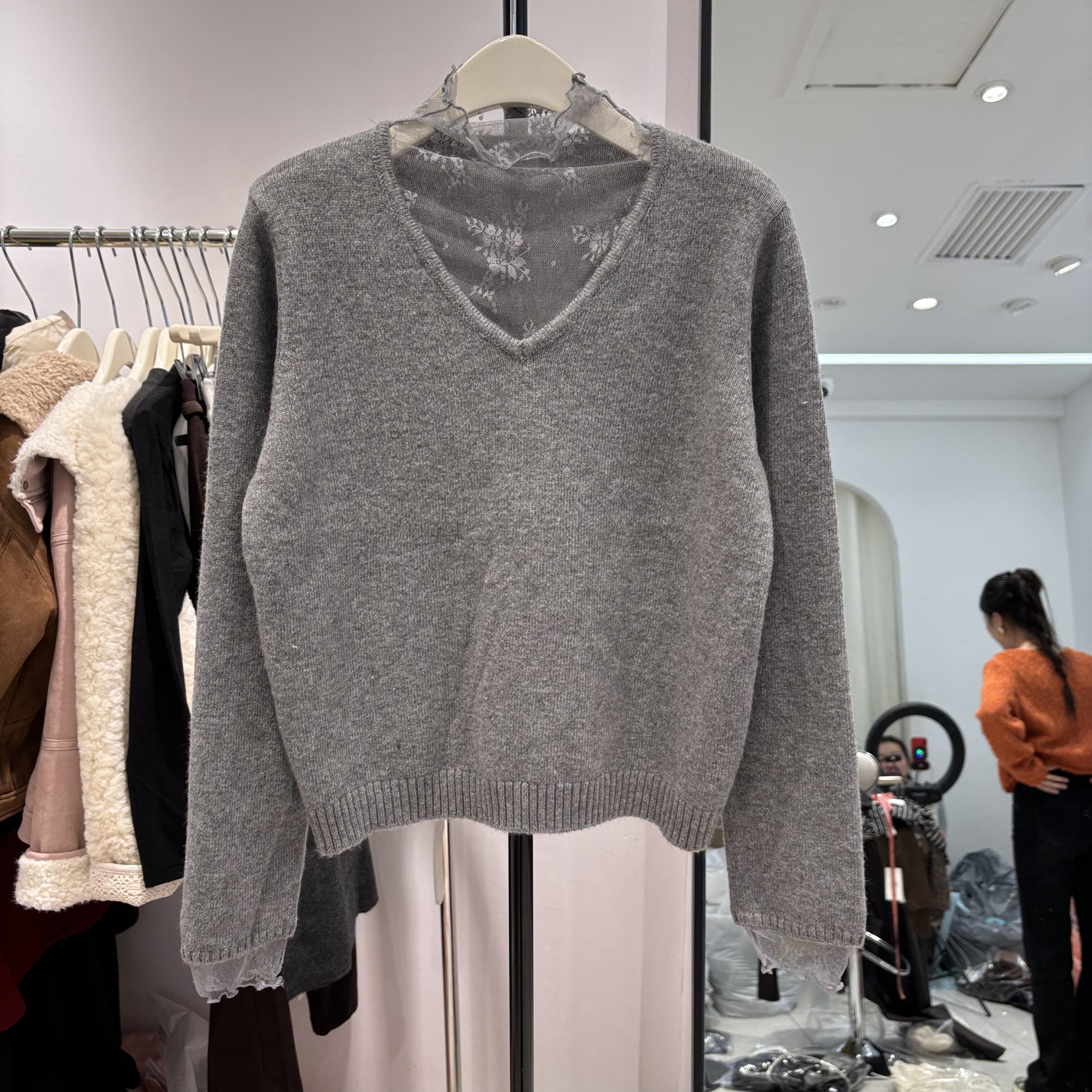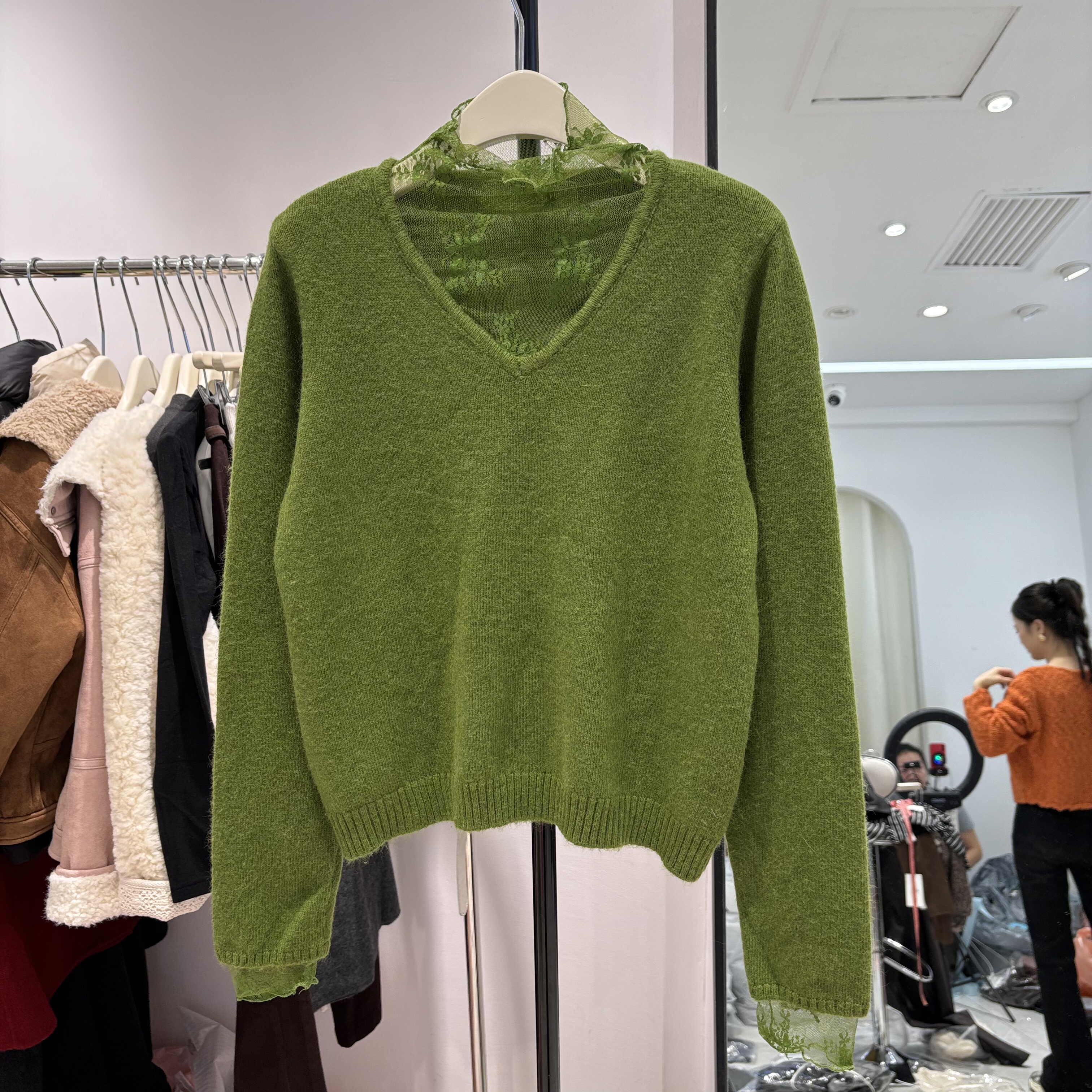 2025秋冬新款韩版宽松显瘦蕾丝拼接半高领长袖针织衫套头毛衣上衣