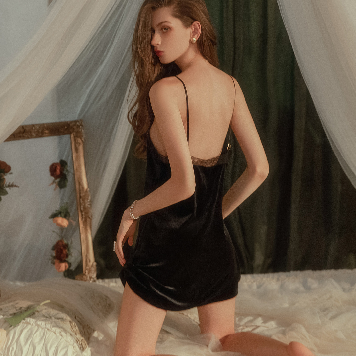 今夕何夕性感睡衣女秋冬金丝绒法式复古风小胸吊带睡裙睡袍两件套