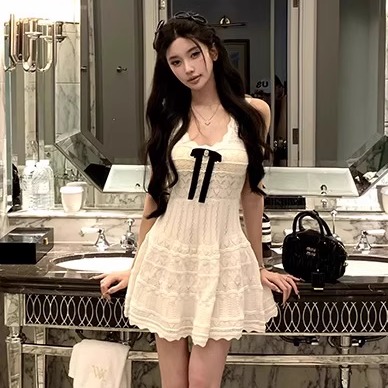 港味风格吊带连衣裙女夏季新款蝴蝶结短裙钩花镂空纯欲针织背心裙