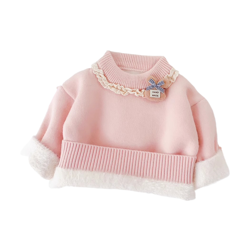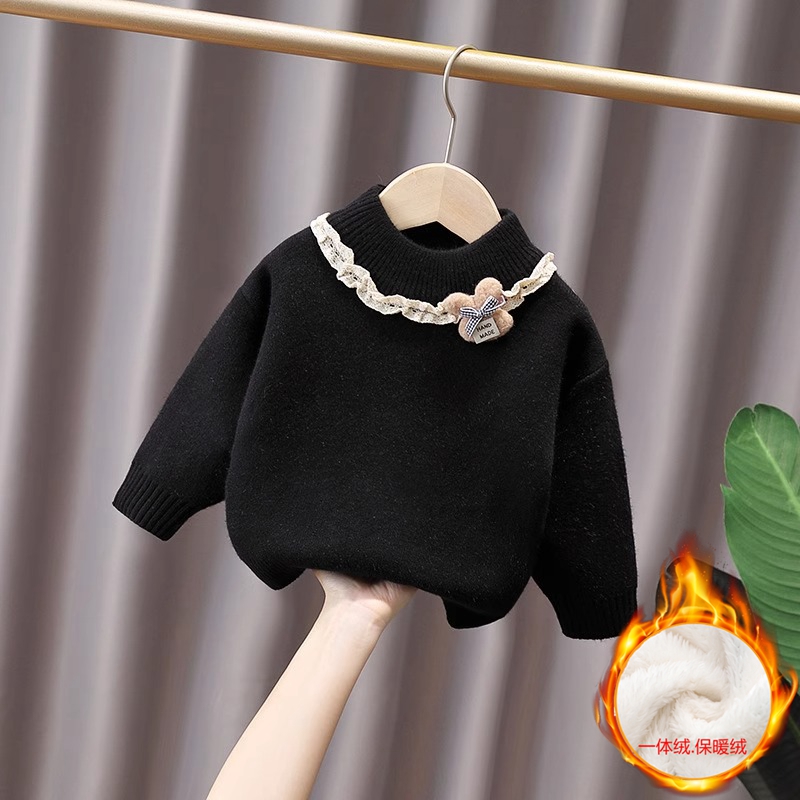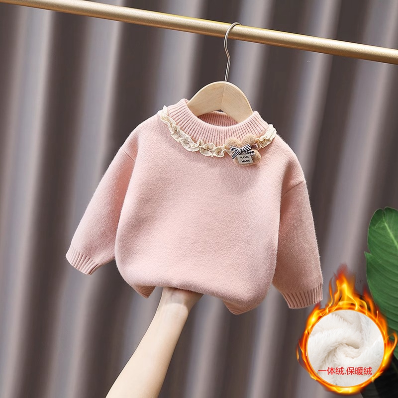 女童一体绒毛衣蕾丝边洋气中小童冬装加绒儿童2025新款宝宝打底衫