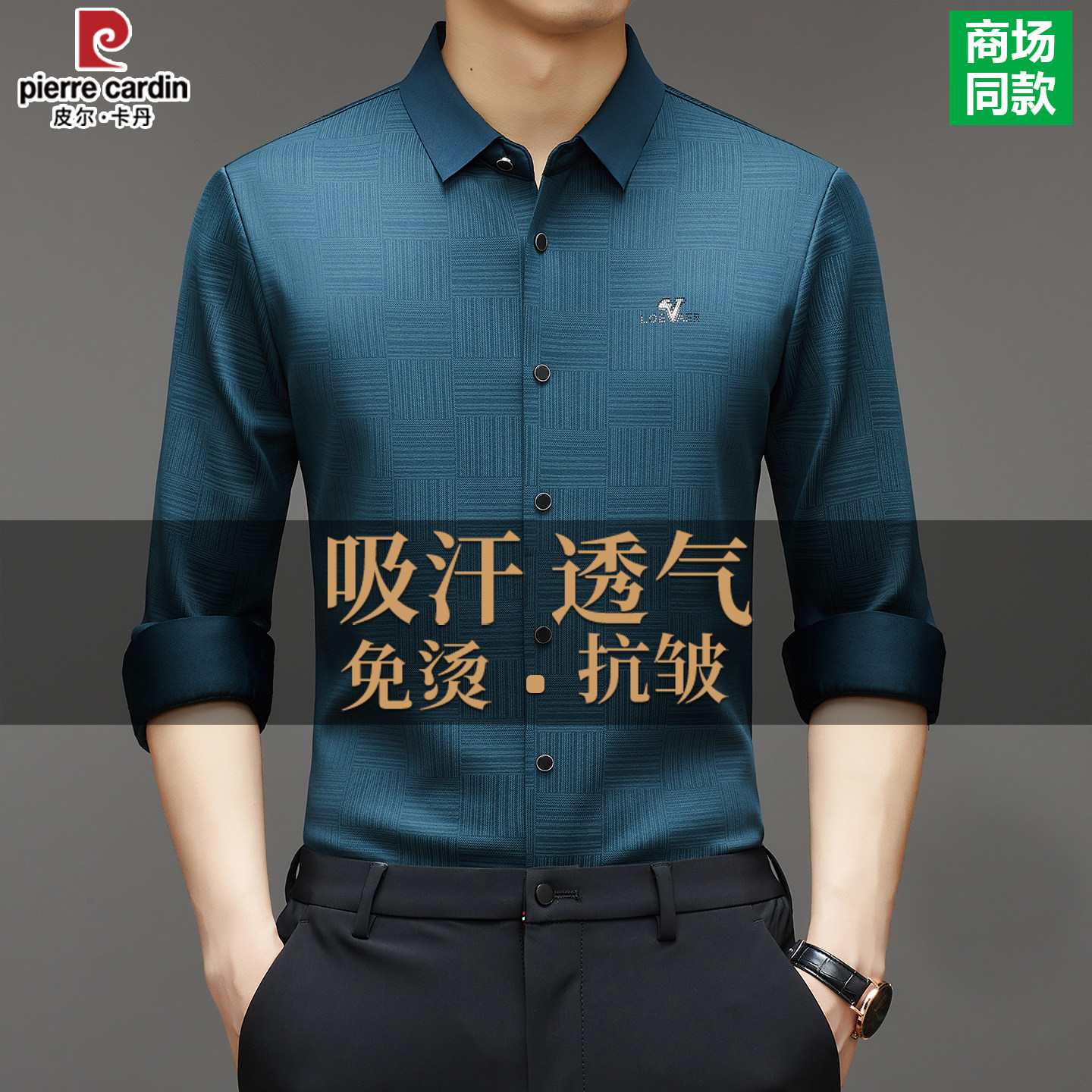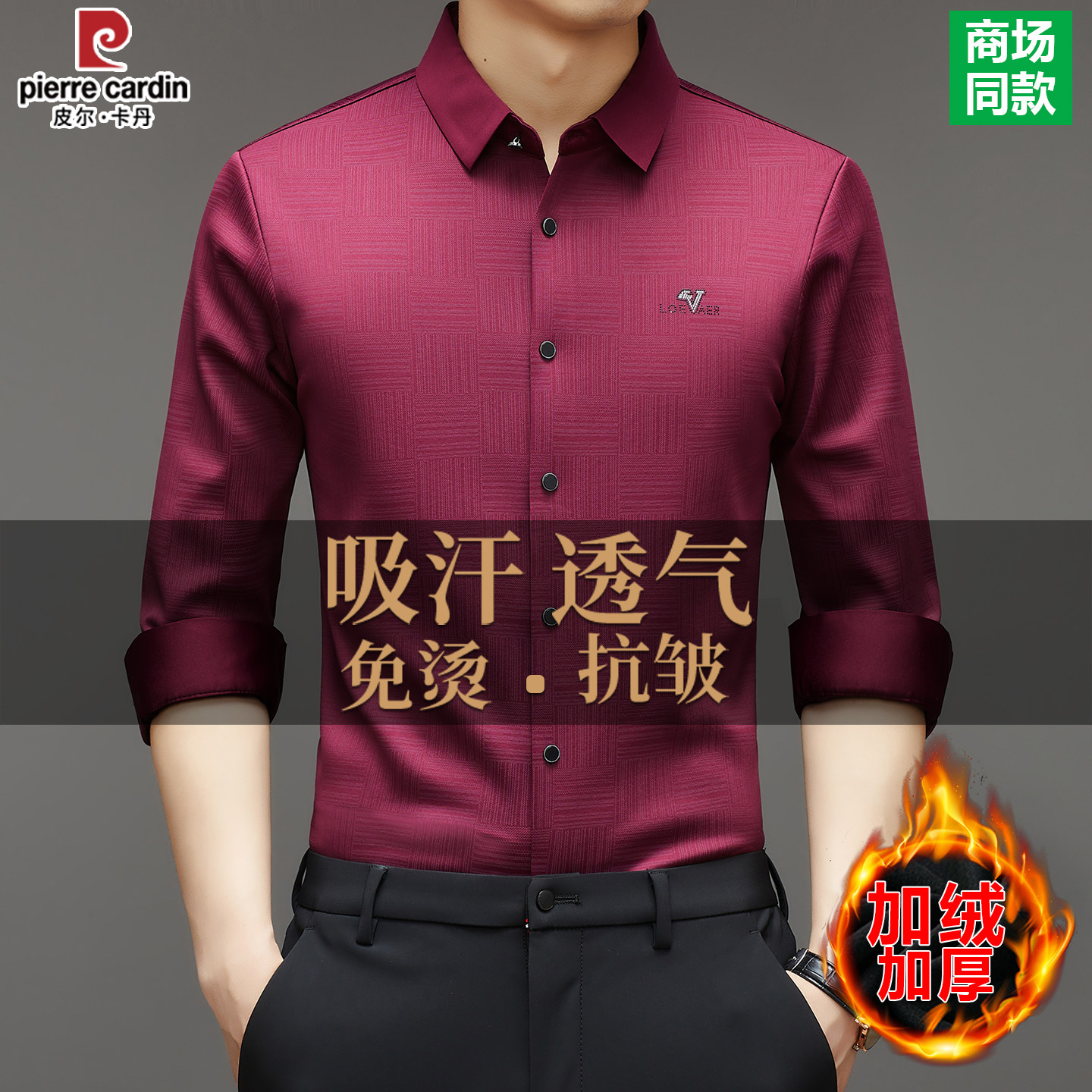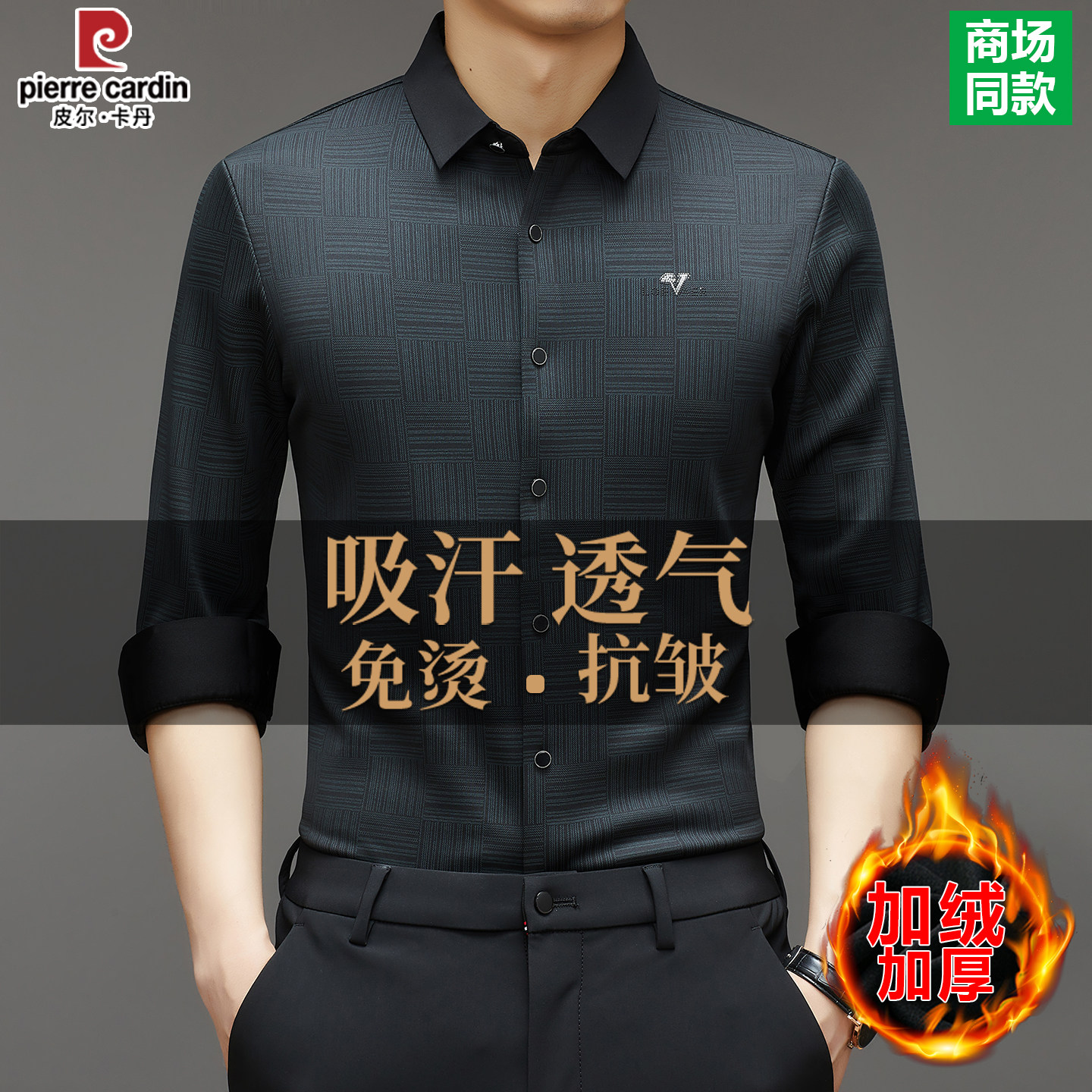 皮尔卡丹男士桑蚕丝高档长袖衬衫商务休闲加绒加厚保暖免烫衬衣