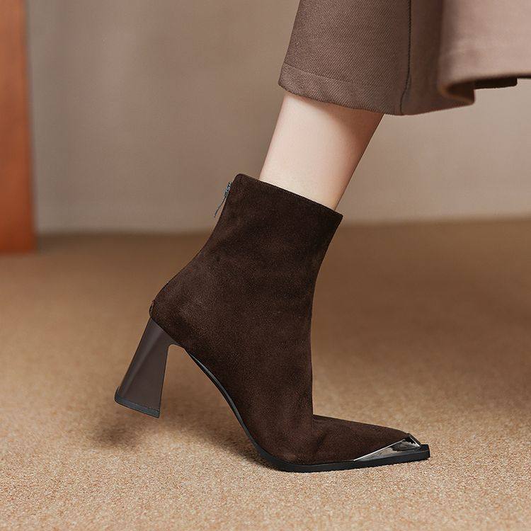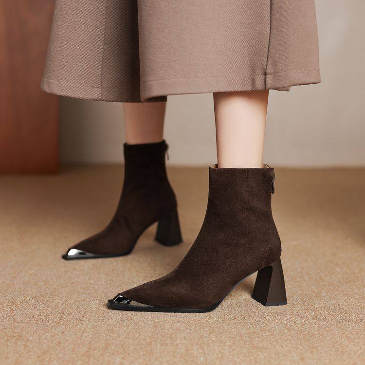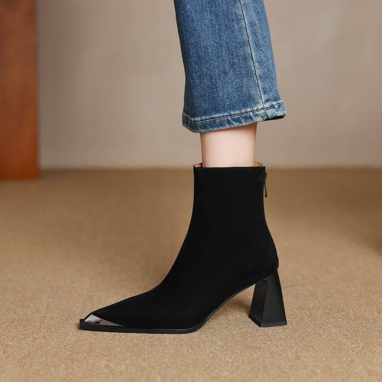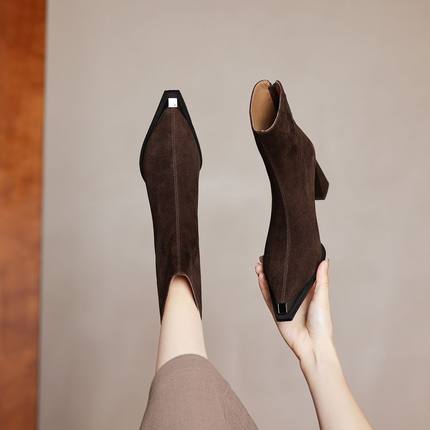 巨好看~手工订制真皮羊翻皮短靴女单靴尖头金属包头粗高跟百搭女