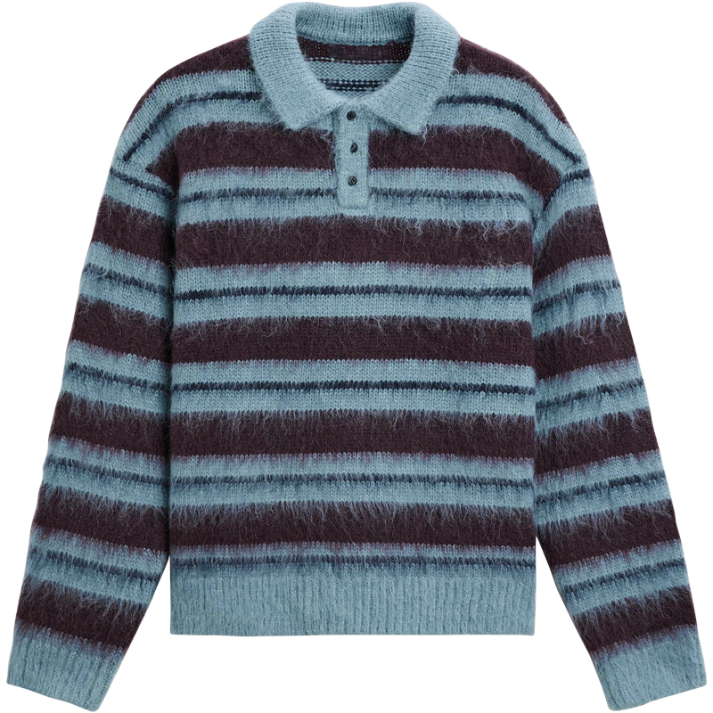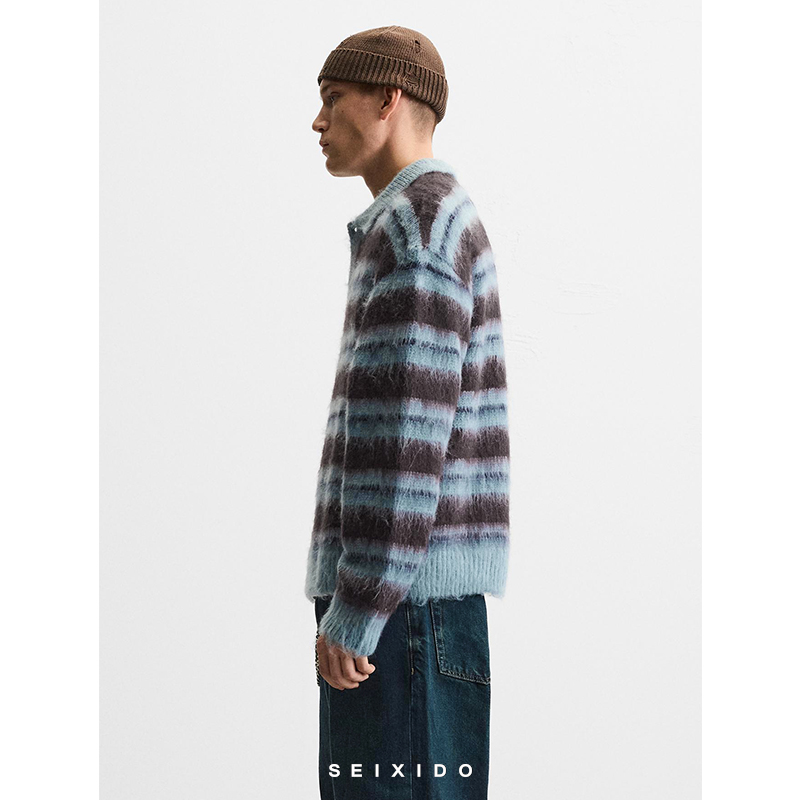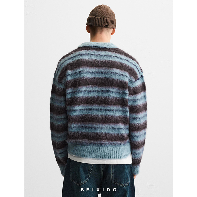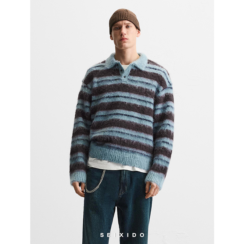 柜319!秋冬新品男装欧美简约拉绒条纹翻领休闲针织衫毛衣9598395