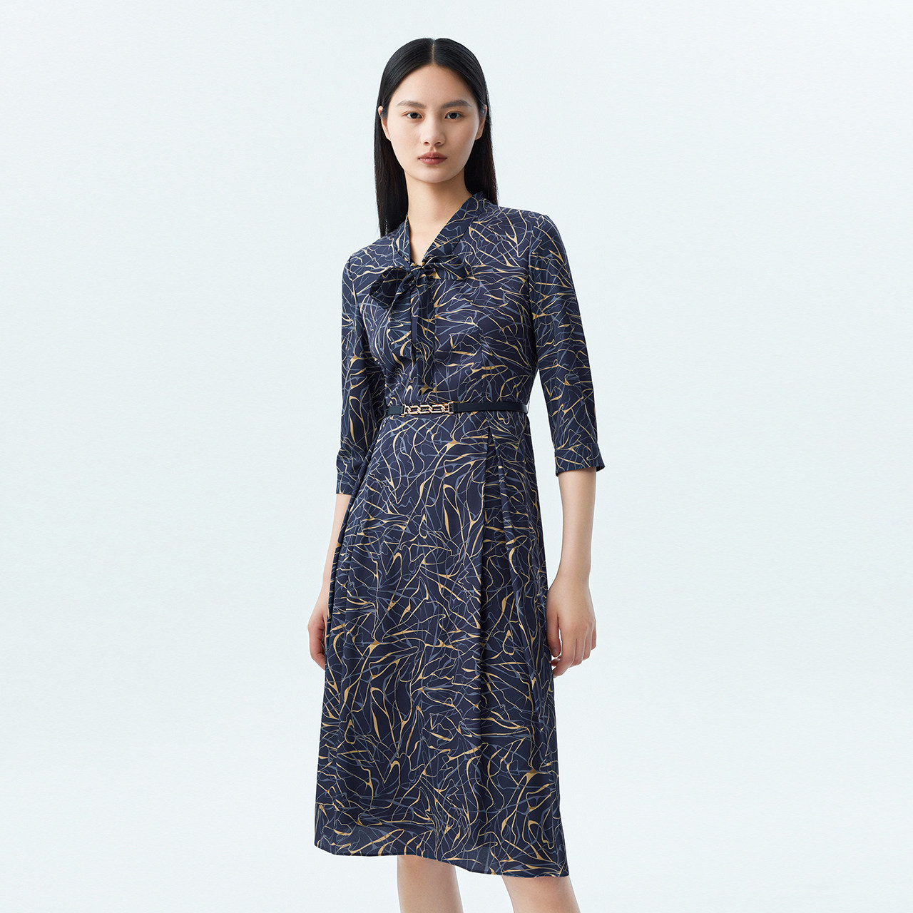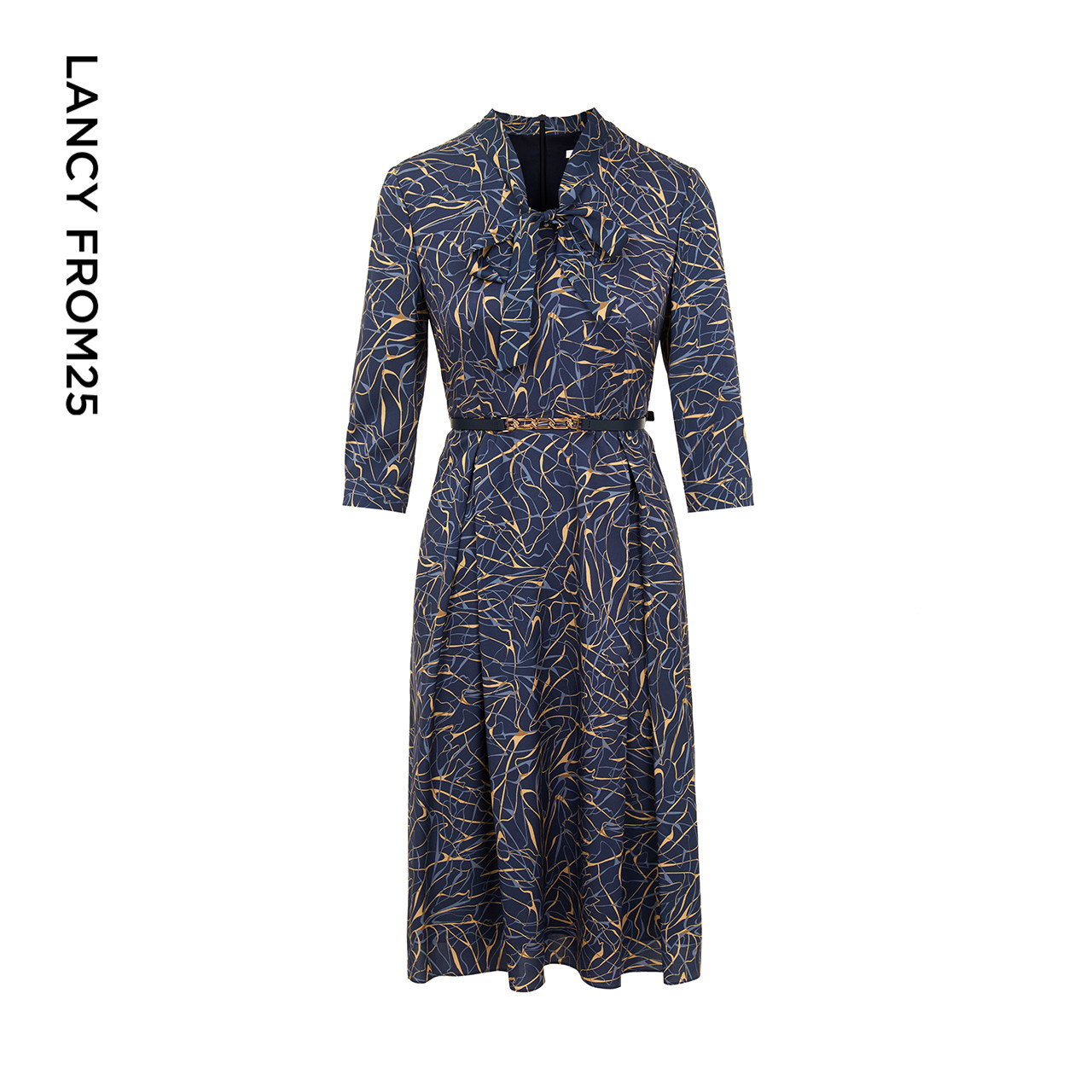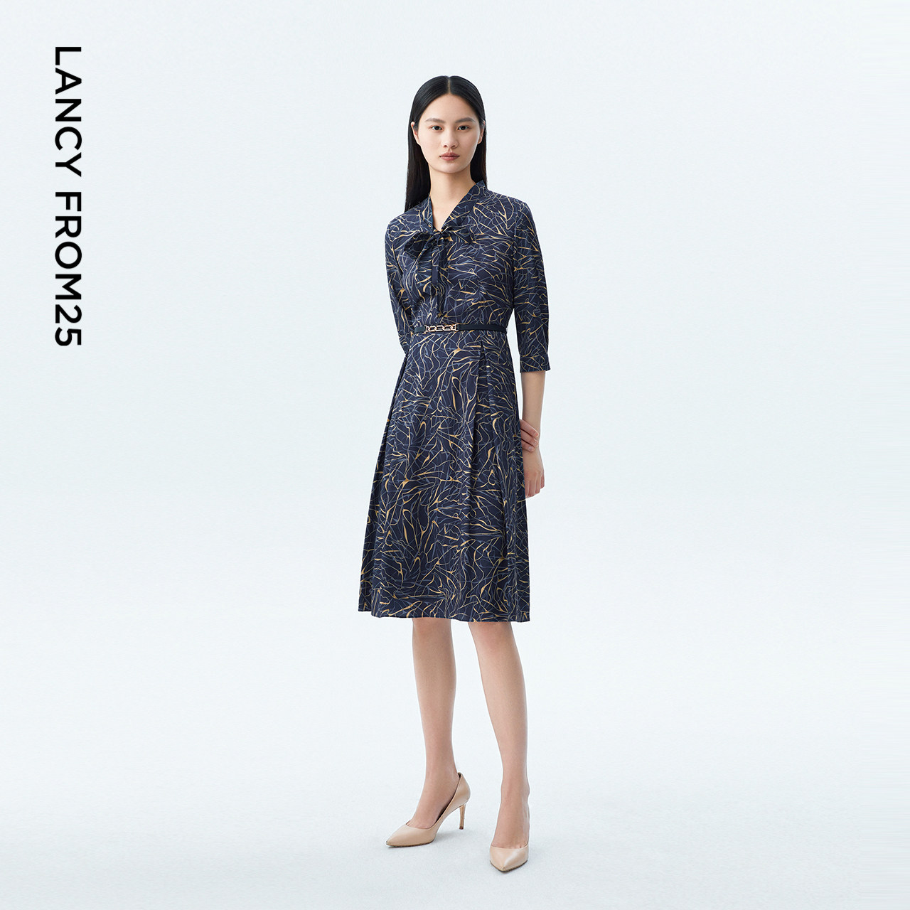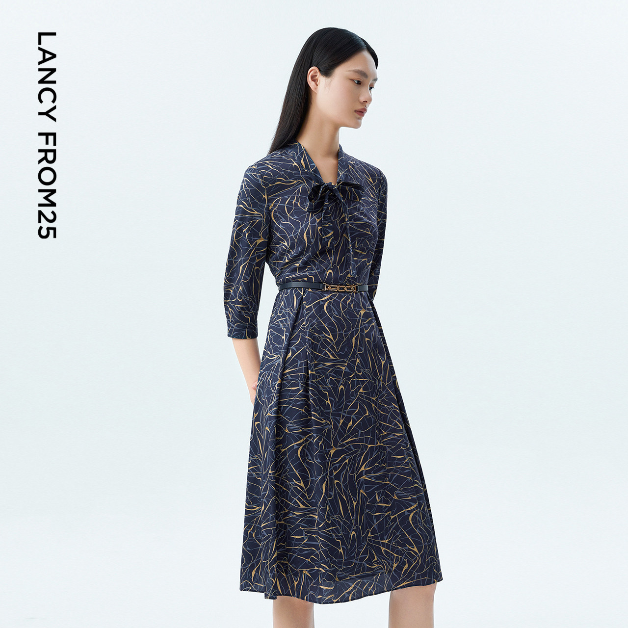 【真丝】LANCY/朗姿2023秋季新款收腰显瘦印花飘带长连衣裙子女