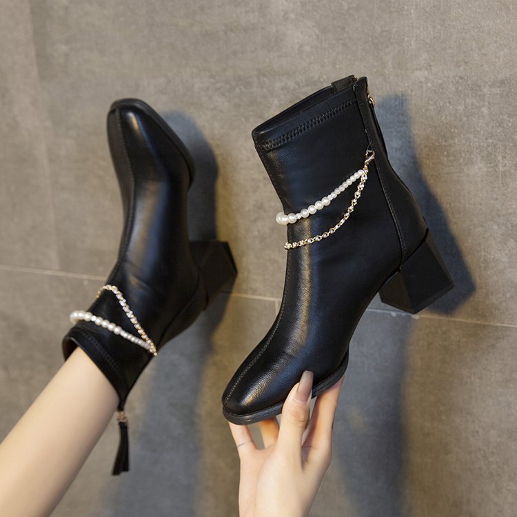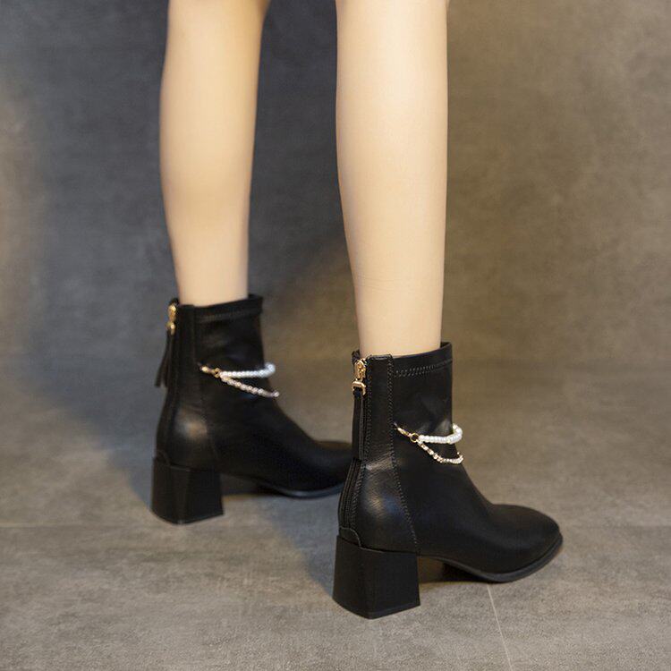法式白色高跟气质短靴女春秋季单靴2025新款粗跟女靴子方头瘦瘦靴