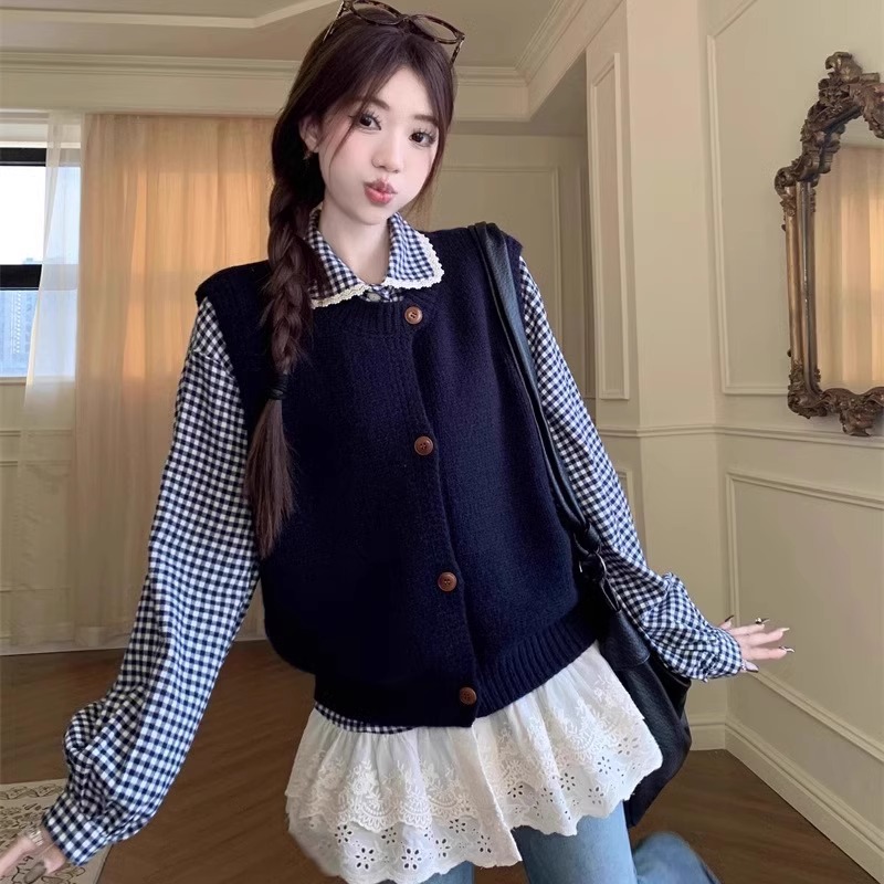 学院风套装韩系女春穿搭针织藏蓝色马甲背心叠穿蕾丝花边长袖衬衫