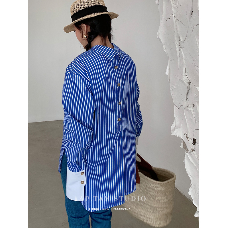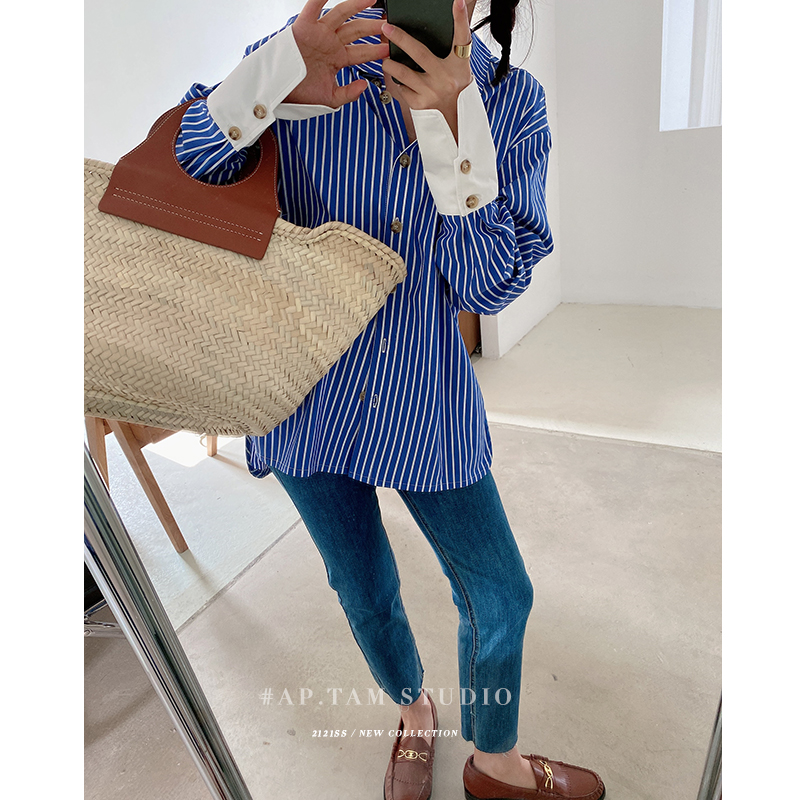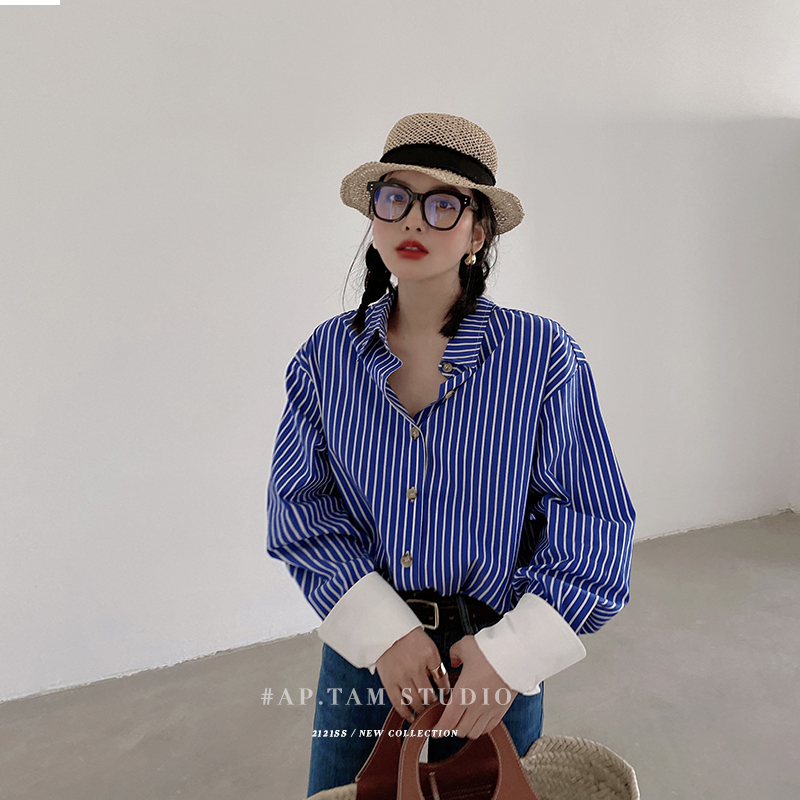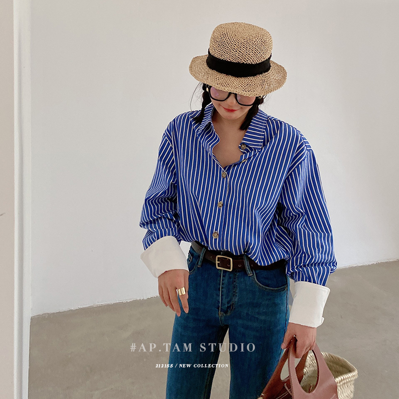 谭烟米 巴黎中产精英腔调 经典蓝白条纹法式正反双开襟长袖衬衫女
