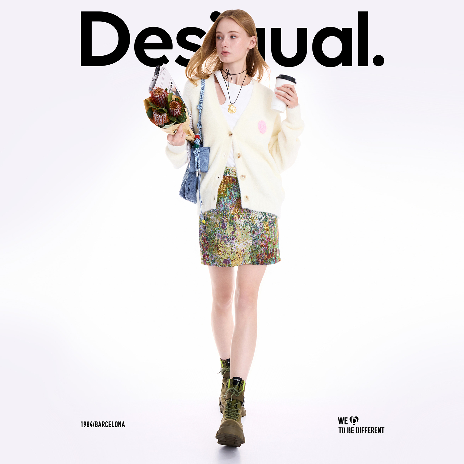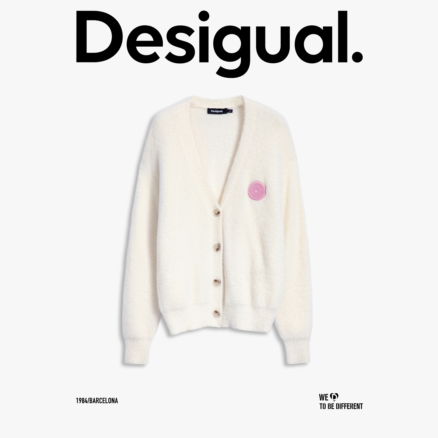 Desigual25秋冬新品宽松仿貂毛圆标长袖针织开衫女式外套