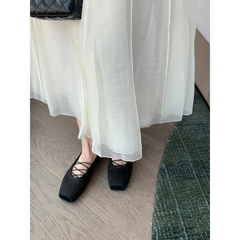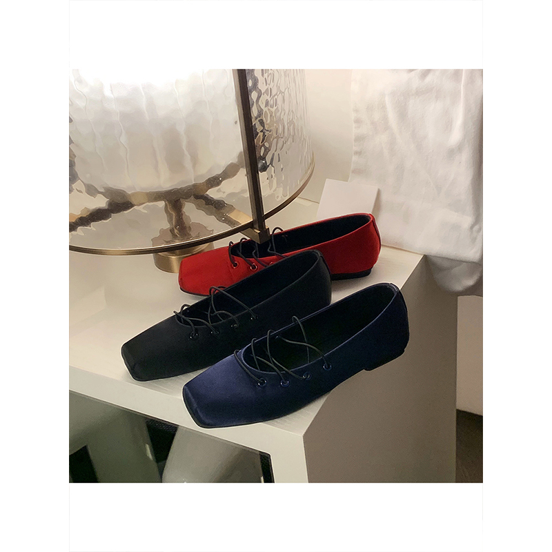 韩系方头浅口芭蕾舞真皮新版复古小众蓝色单鞋玛丽珍绸缎平底鞋女