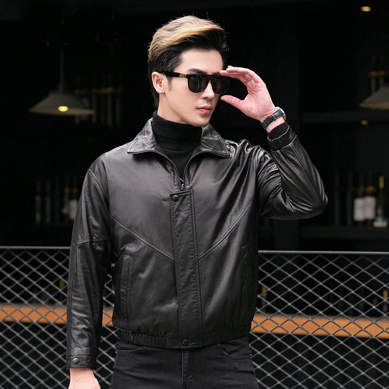 宽松阔版真皮皮衣男头层山羊皮短款立翻领外套海宁青年落肩皮夹克
