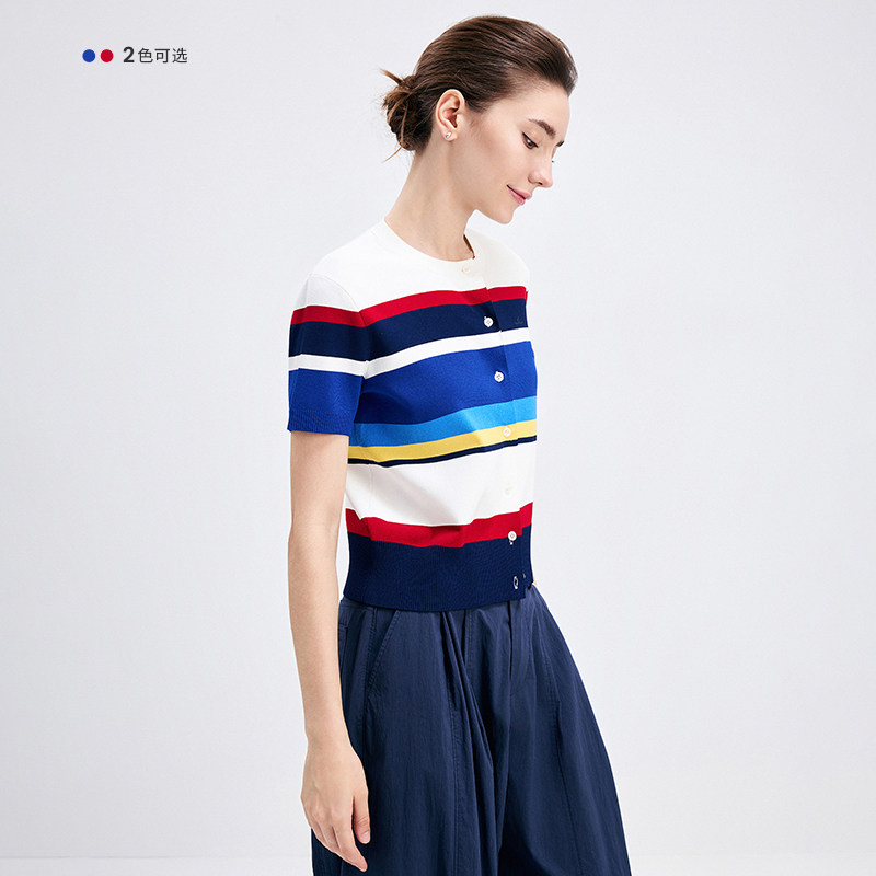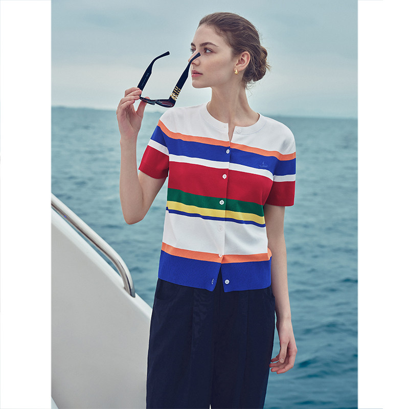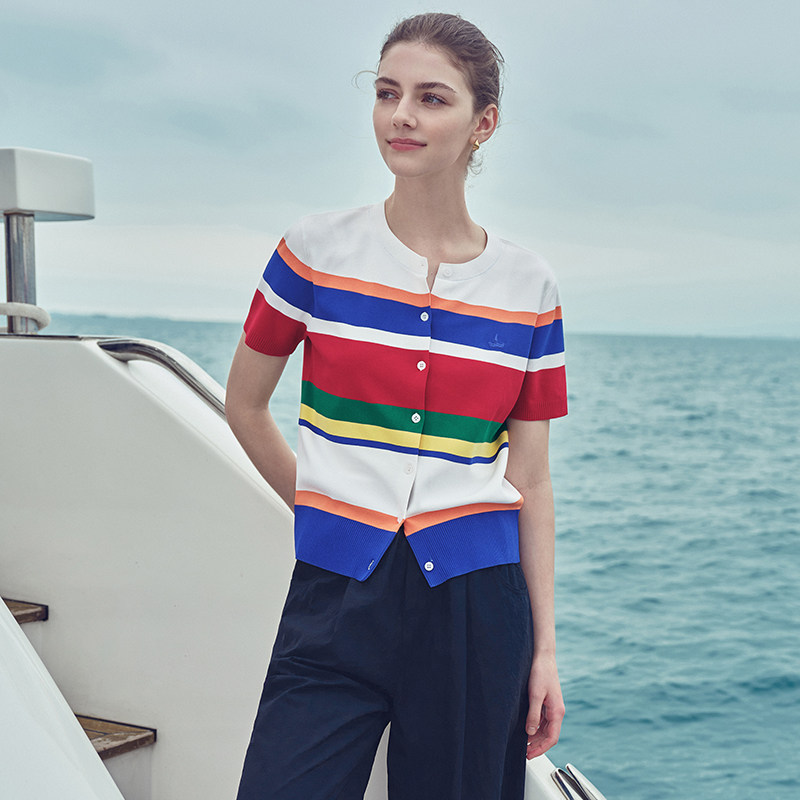 Navigare意大利小帆船休闲短袖针织衫女2025夏季新款百搭条纹开衫