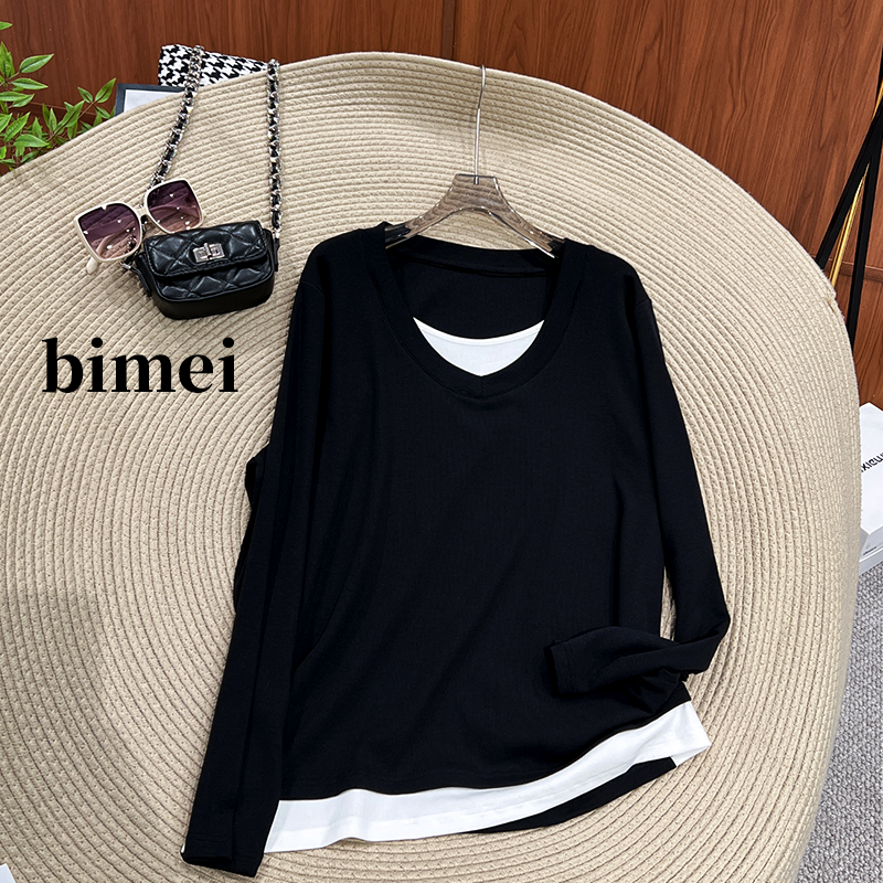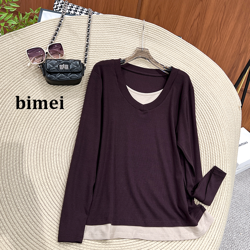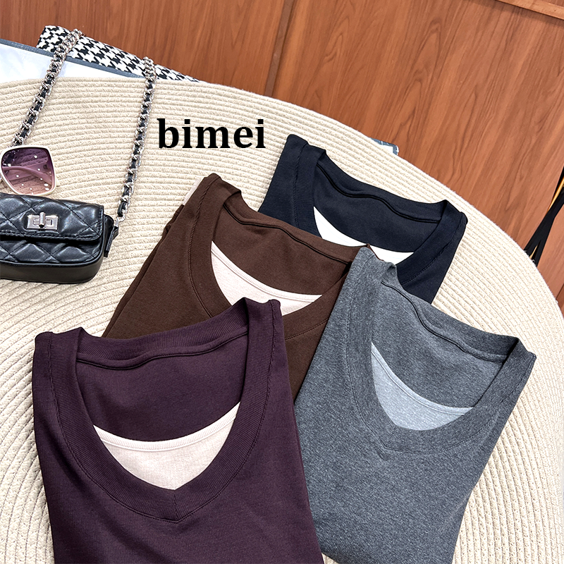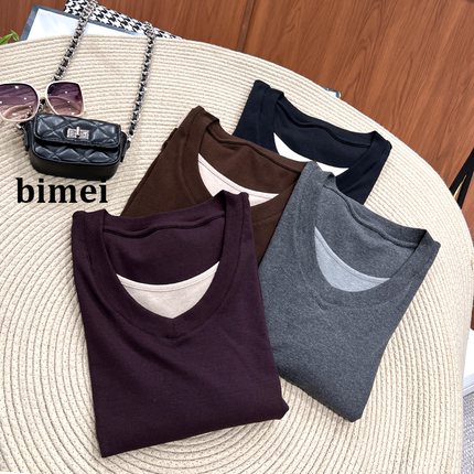 必魅-韩系撞色拼接宽松V领针织T恤2025秋季新款打底衫上衣59312