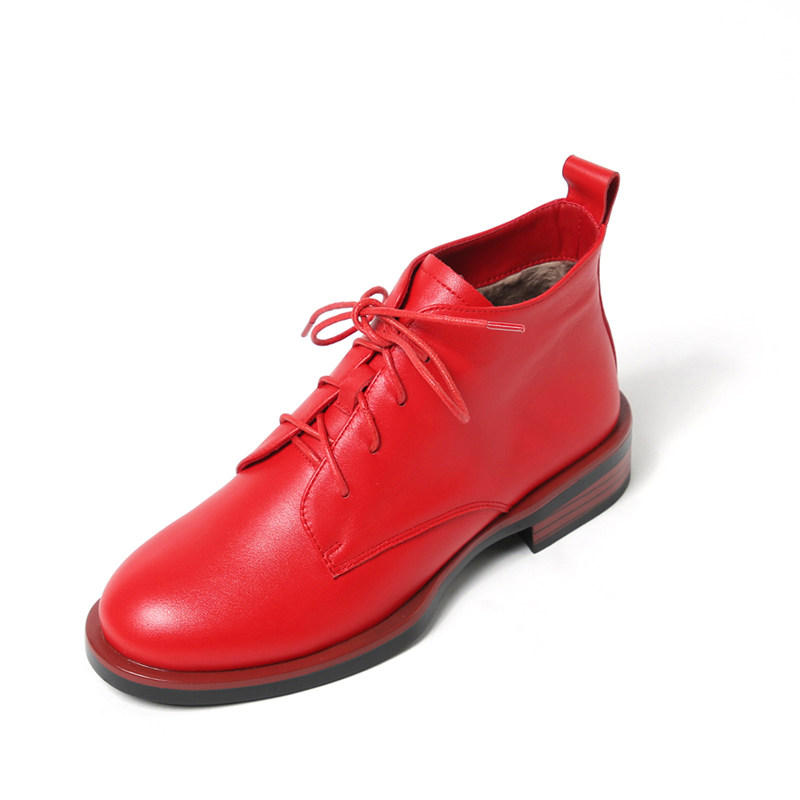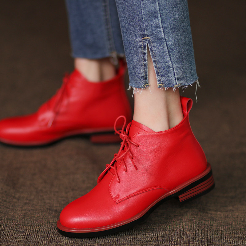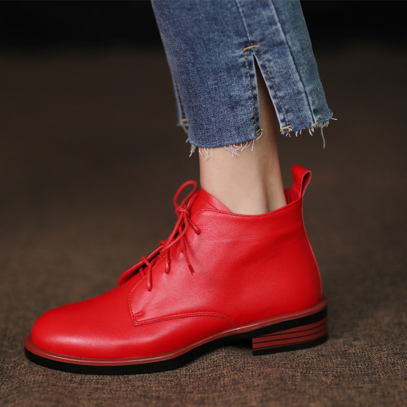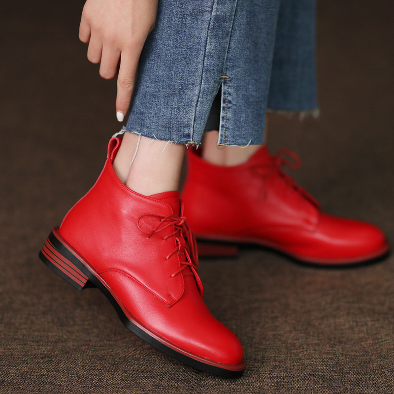 圆头红色皮鞋女短靴系带马丁靴