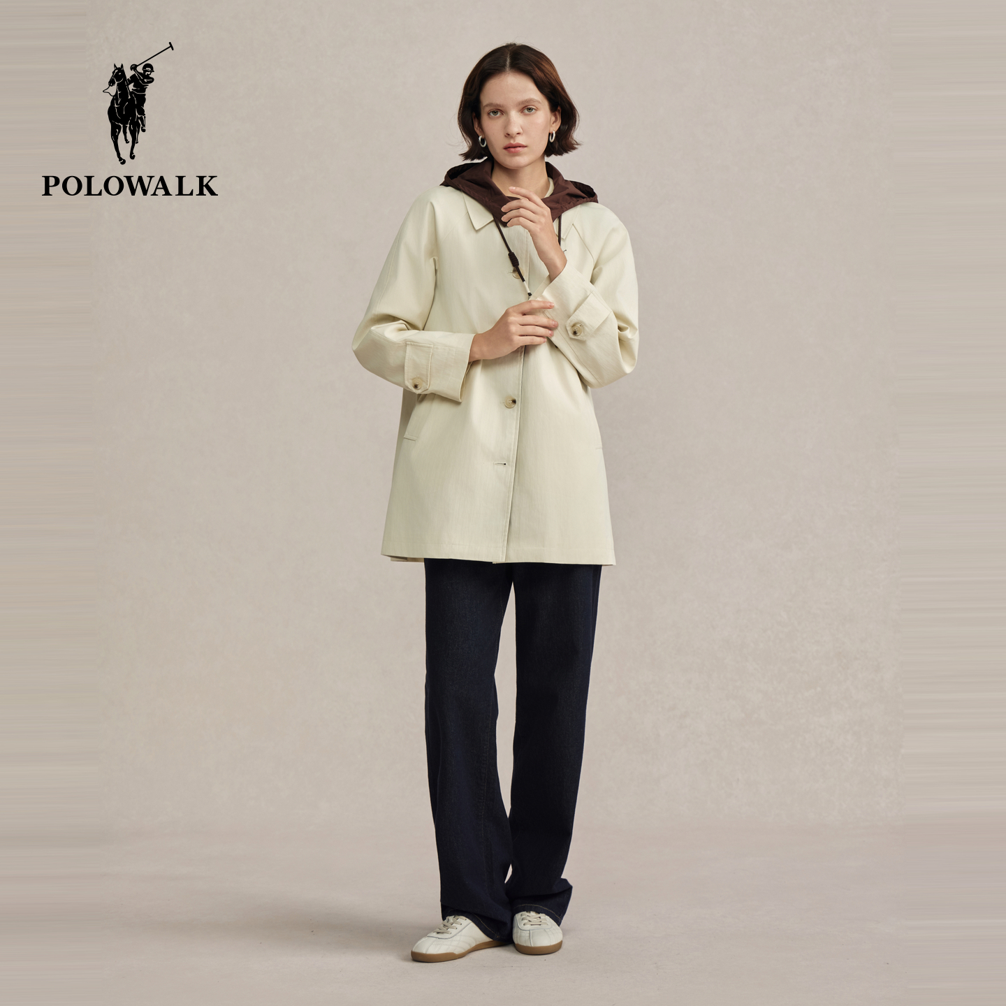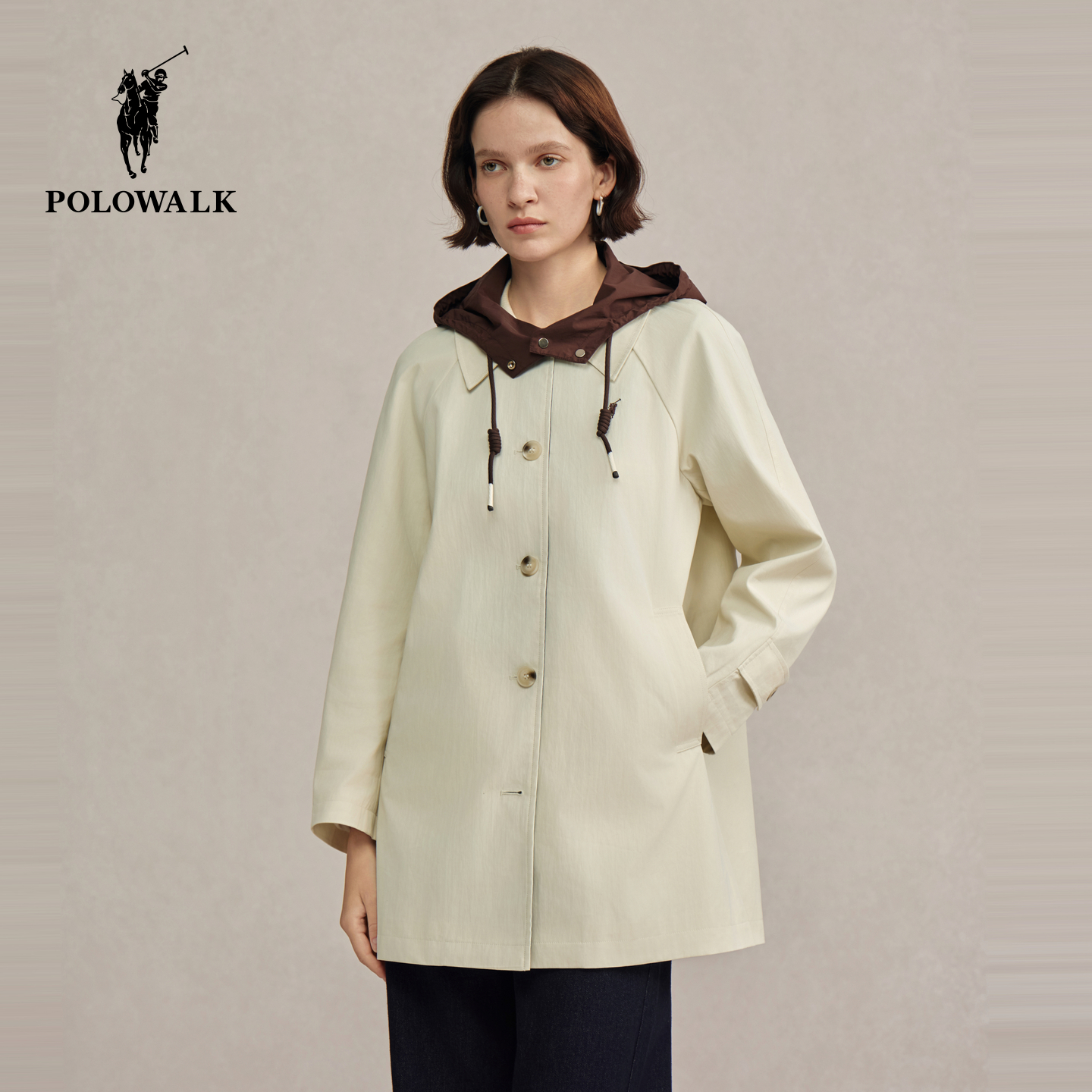 POLOWALK女装风衣2025秋冬新款女士中长款连帽外套法式时尚上衣