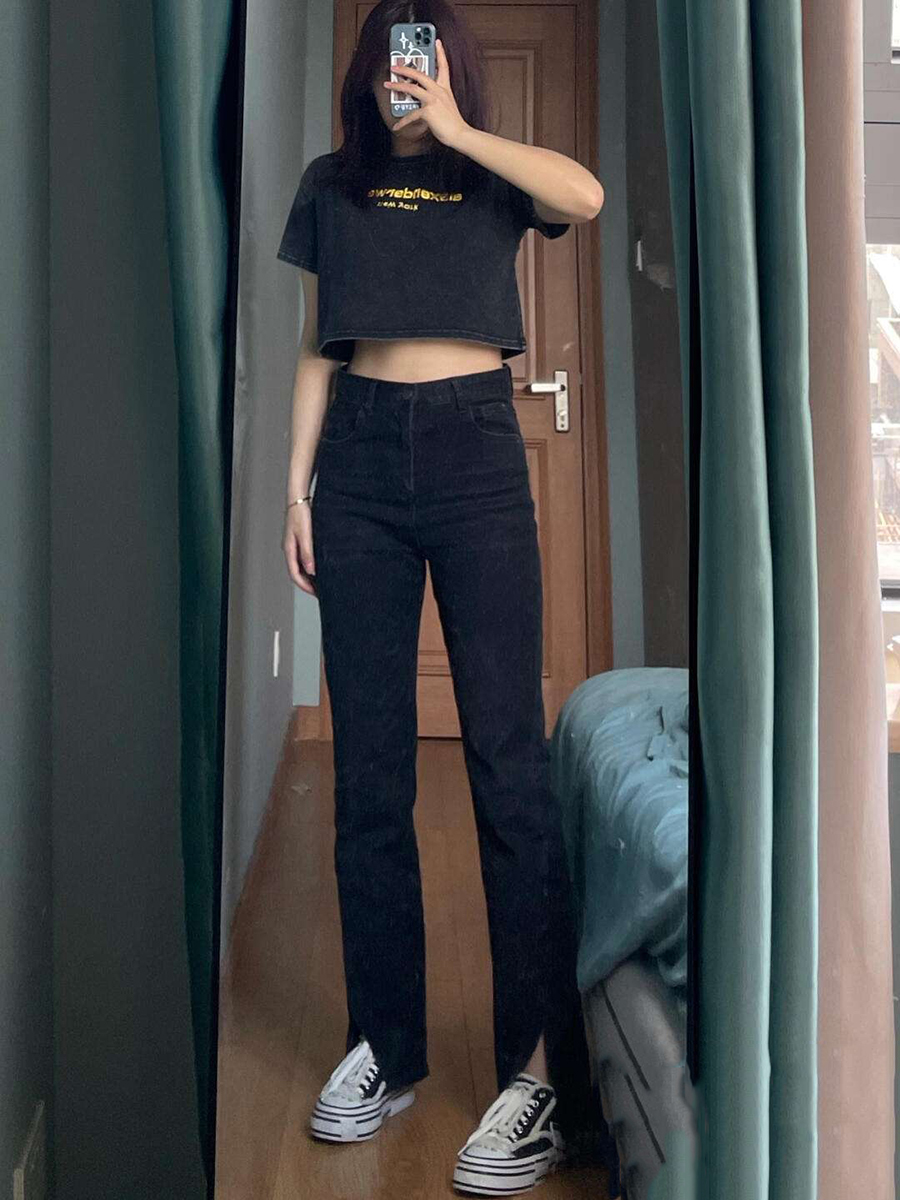 大码开叉牛仔裤女春季新款胖妹妹mm高腰显瘦微喇叭直筒黑色裤子潮