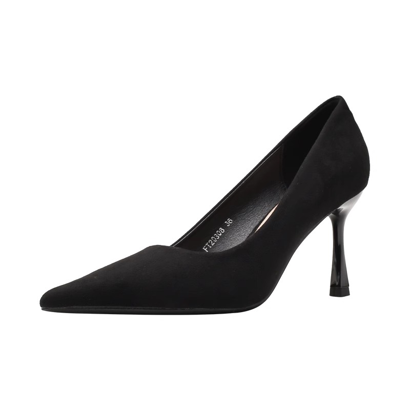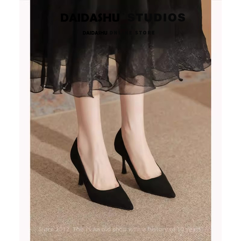 真皮高跟鞋女2025年新款黑色细跟职业绒面浅口通勤不累脚尖头单鞋