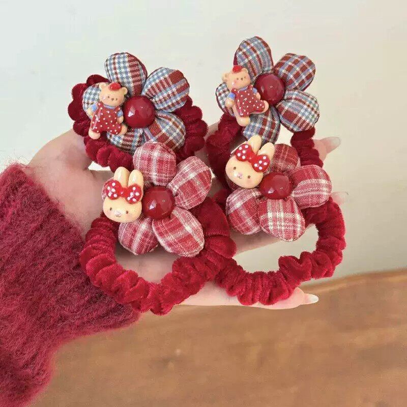 红色格纹花朵发圈儿童秋冬植绒扎发绳可爱卡通丸子头皮筋女童发饰
