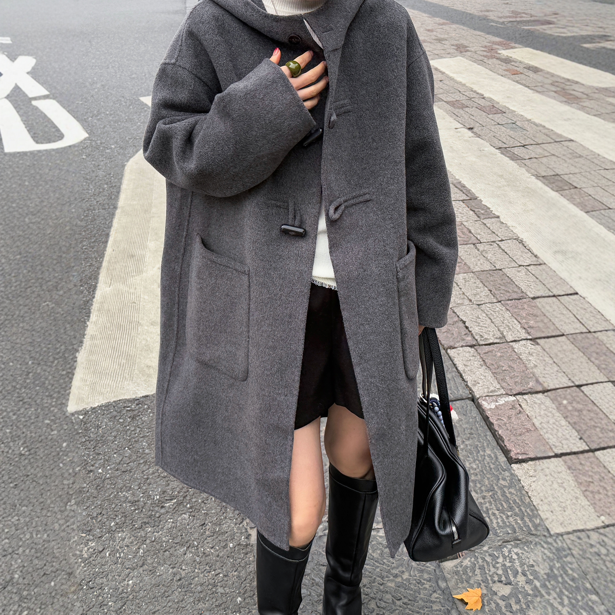 牛角扣连帽双面羊绒大衣女欧洲站