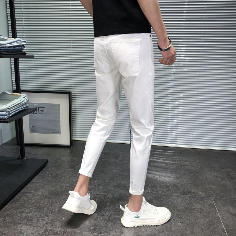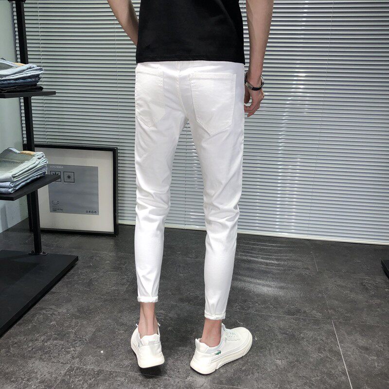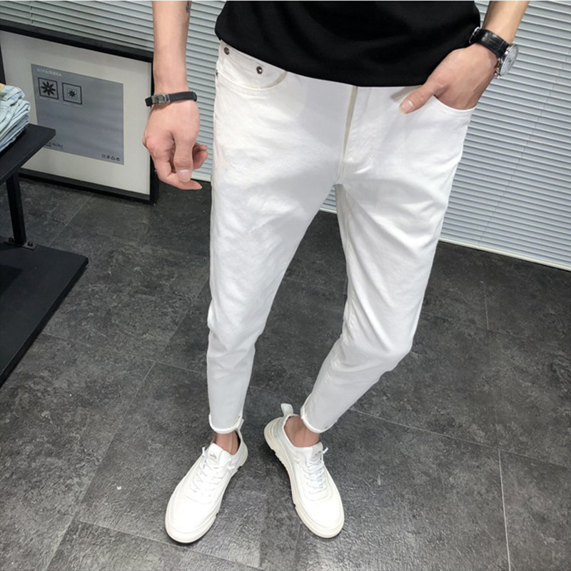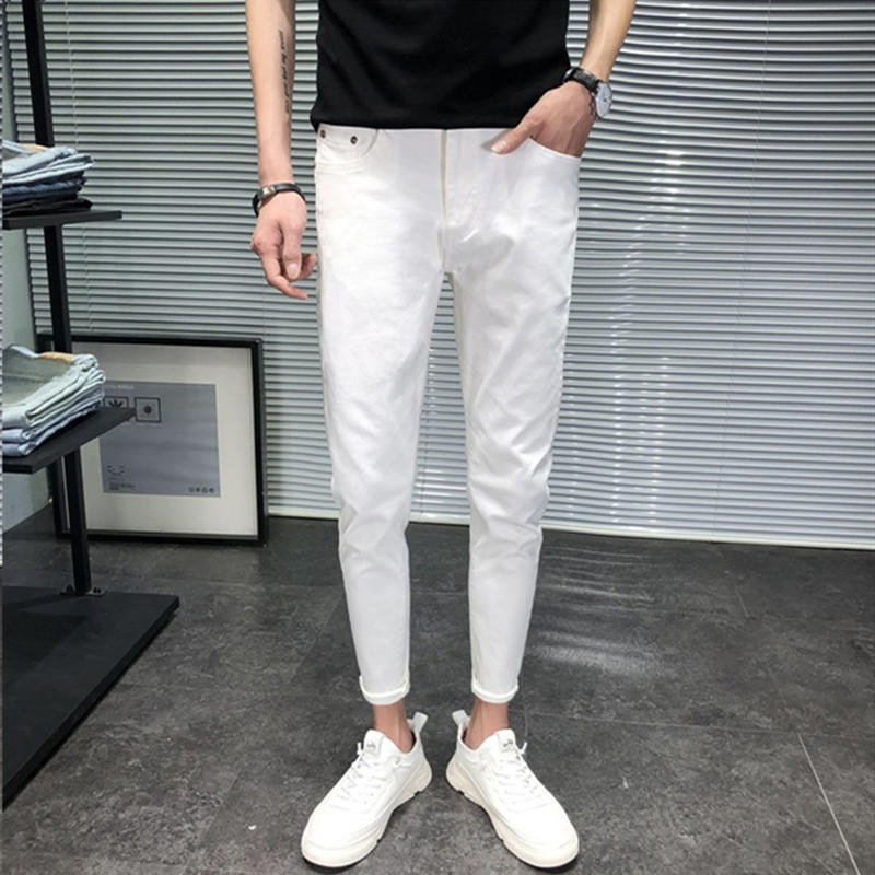 白色牛仔裤男九分裤修身小脚