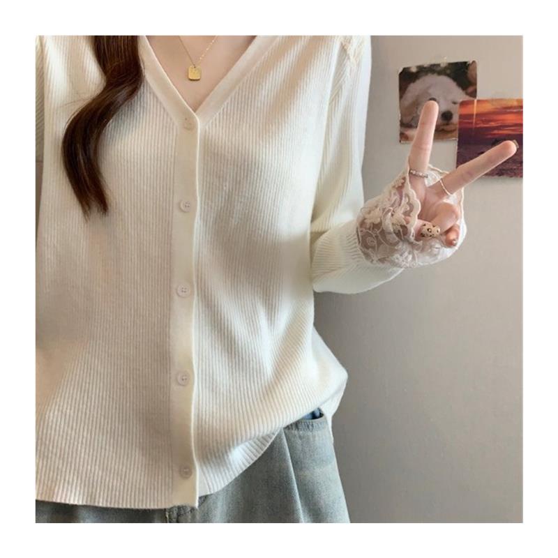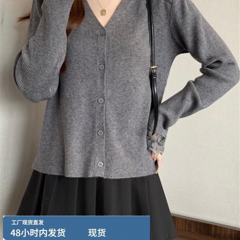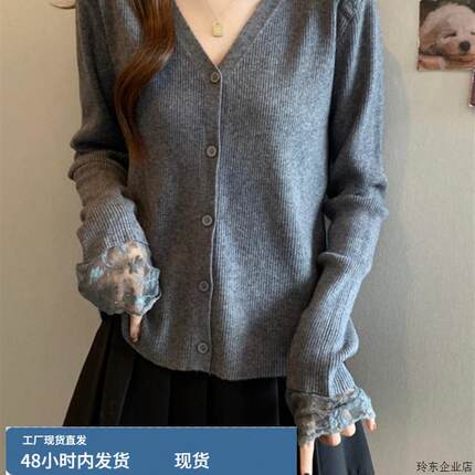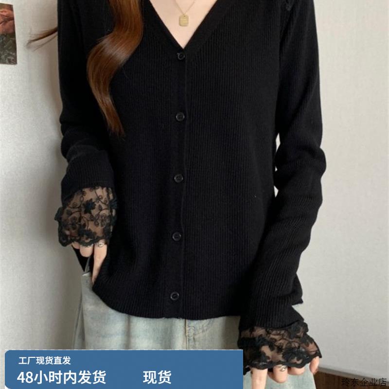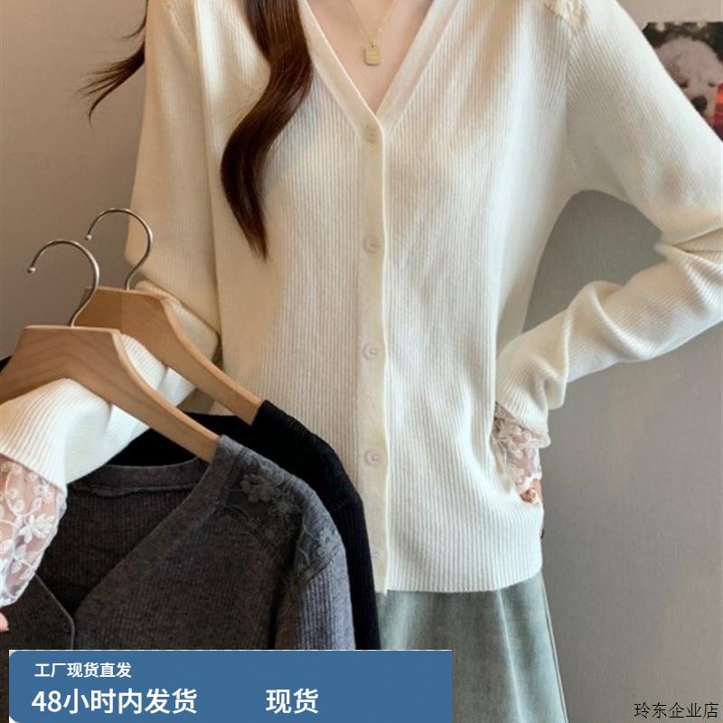 大码女装2025新款韩系漂亮小上衣早秋蕾丝花边拼接减龄款针织开衫
