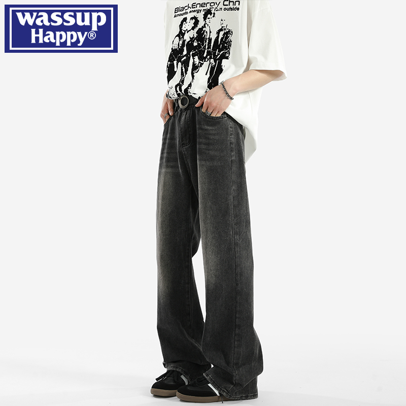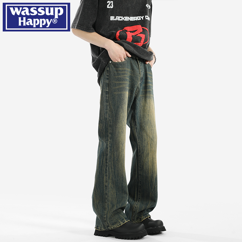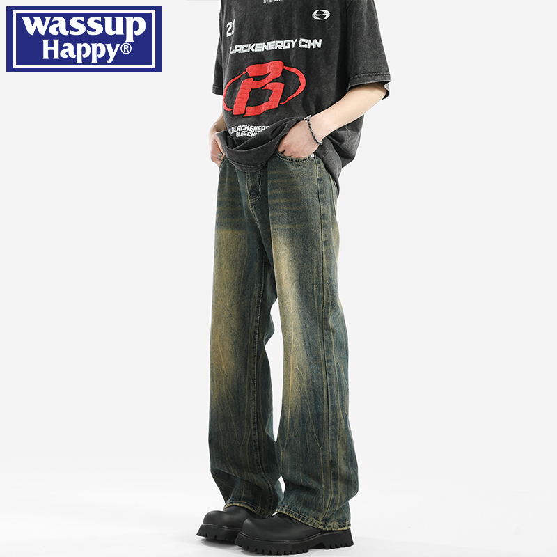 wassup happy复古蓝牛仔裤男士秋冬季款青少年潮流阔腿休闲长裤子