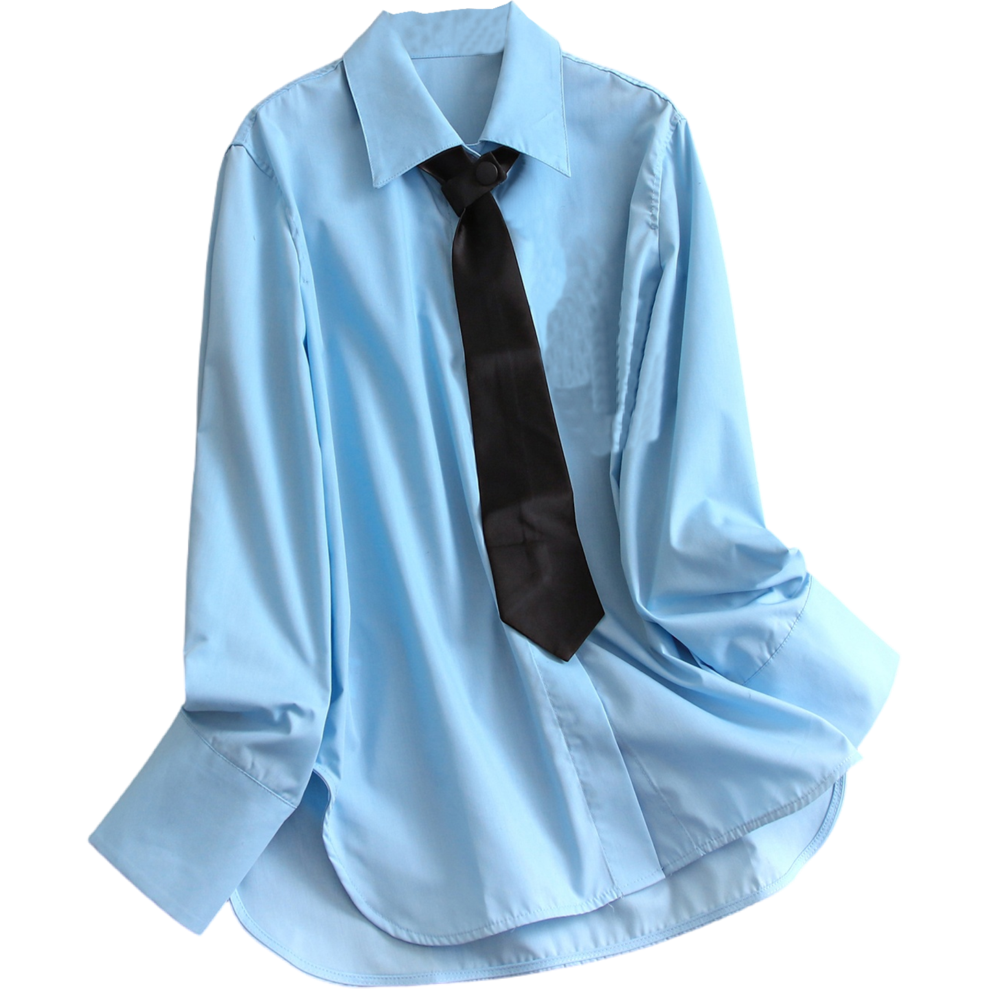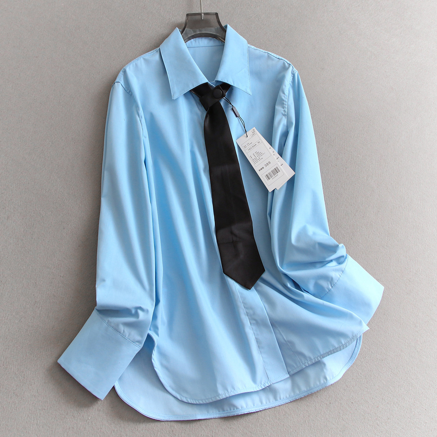 配领带纯色翻领宽松中长款长袖衬衫可配一整套PU皮短裙女套装Q706