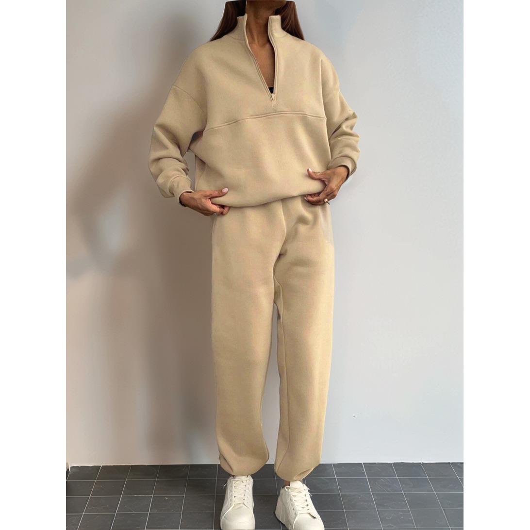 2025欧美亚马逊跨境秋冬女装新款时尚半拉链翻领纯色休闲两件套装