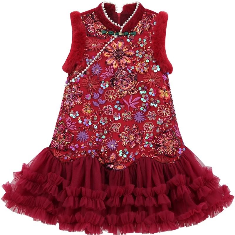 背心网纱拼接拜年服女孩旗袍裙子