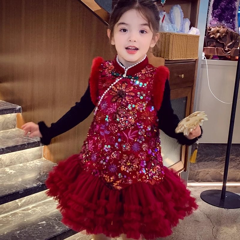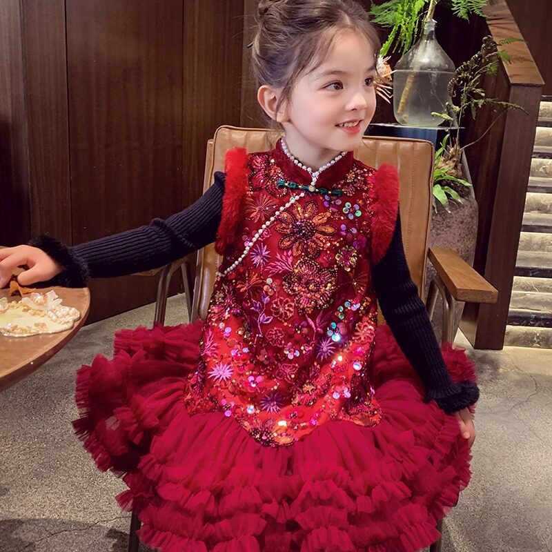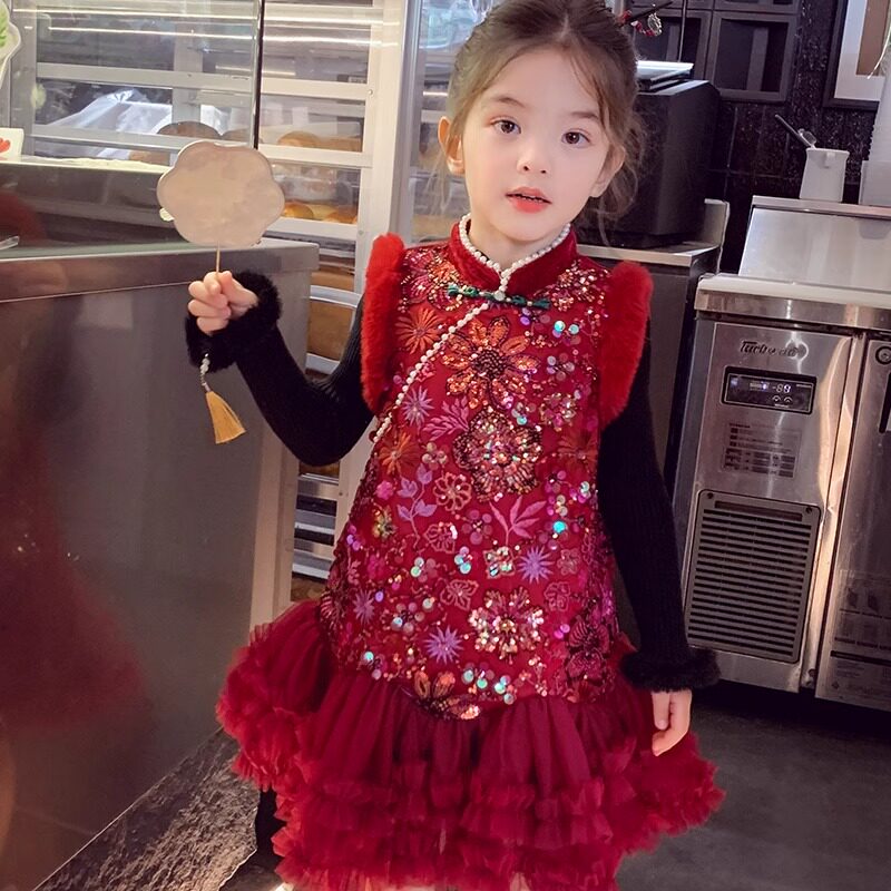 女童新年红色背心连衣裙冬装2025新款网纱拼接拜年服国风旗袍裙子