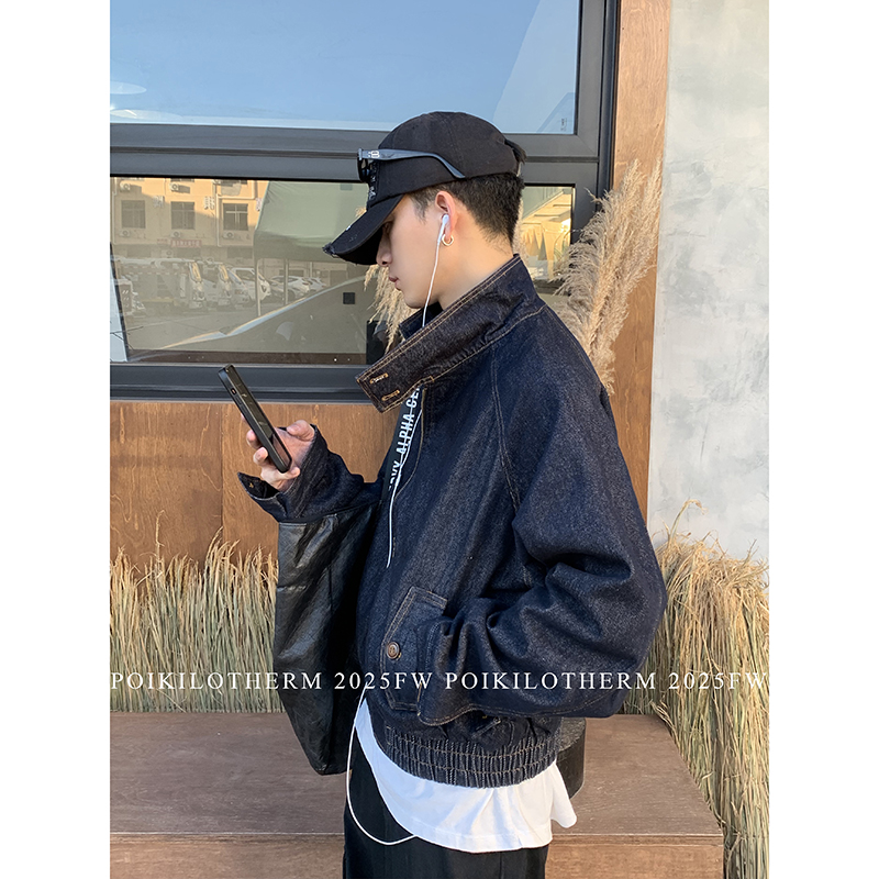 PLTH*美式复古原牛纽扣立领牛仔外套男女高级感小众简约短款夹克