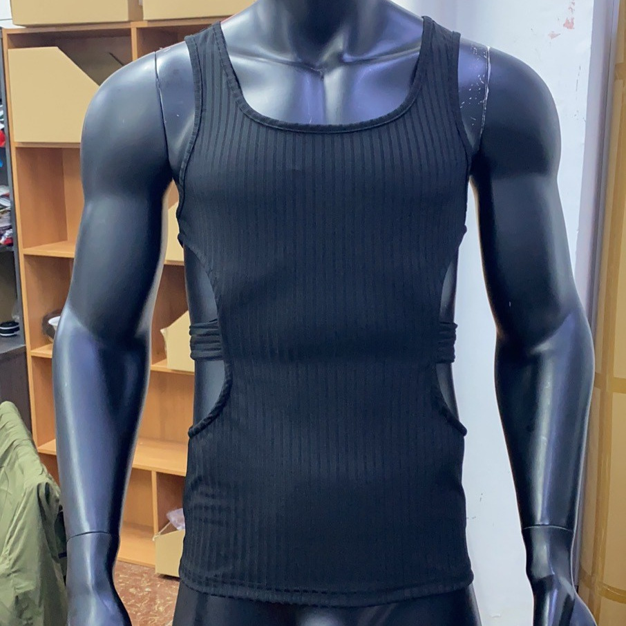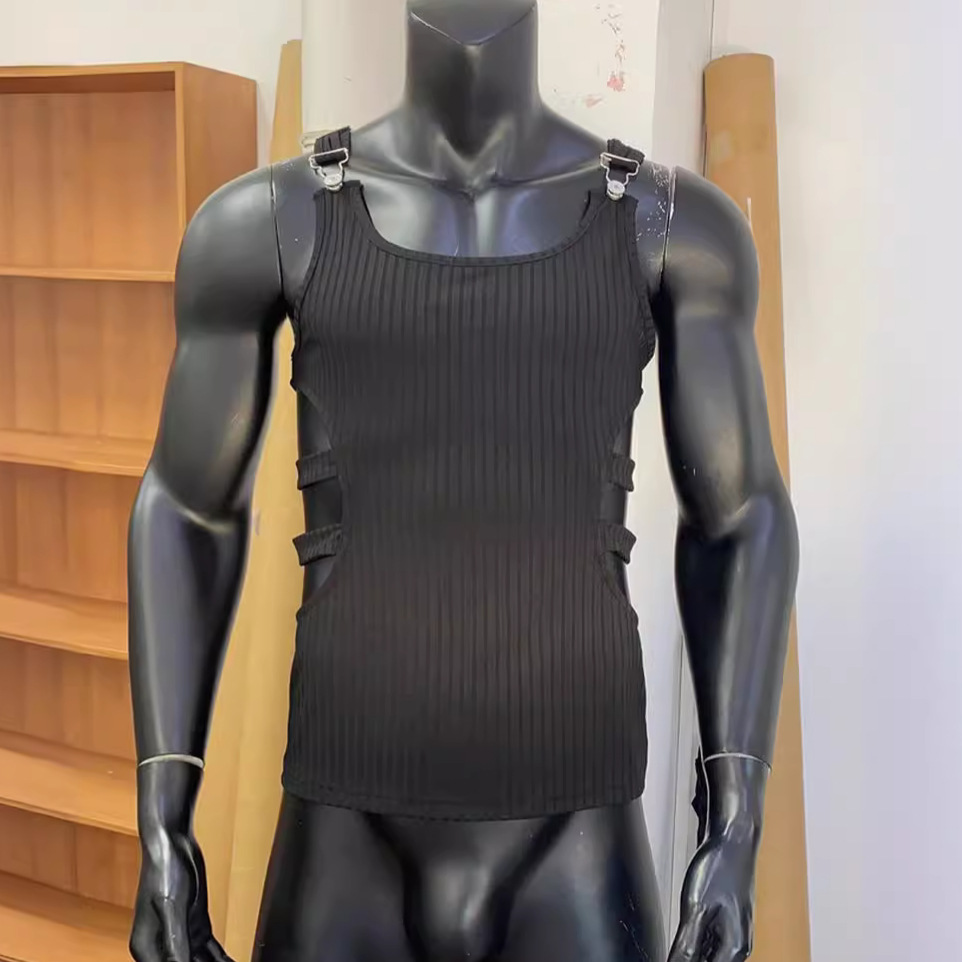 欧美镂空纯色弹力修身上衣街头运动个性工装美式背心男士无袖t恤